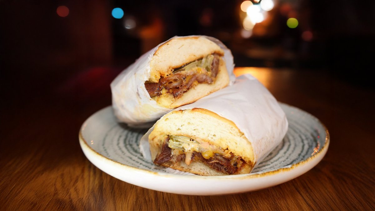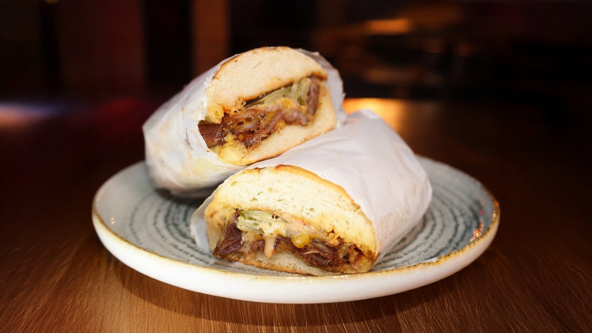 chifla, carne de vita, bacon, ardei kapia murati, salata iceberg, castraveti murati, branza cheddar, sosul casei, ceapa rosie + cartofi prajiti - 450g