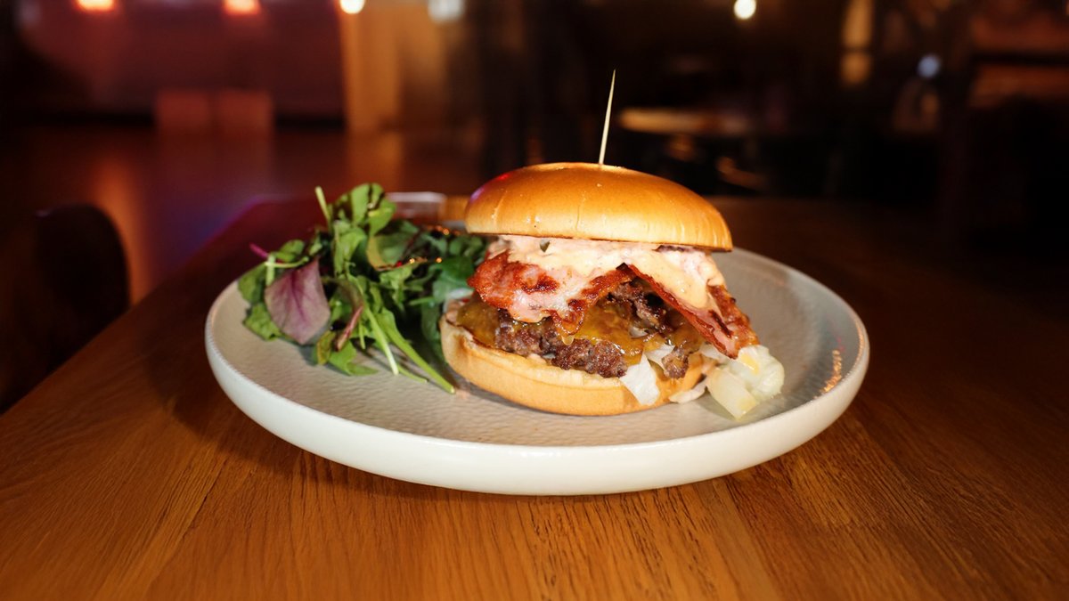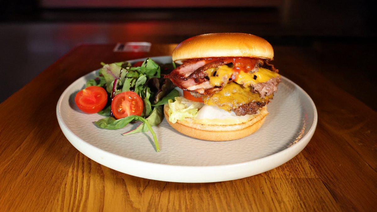 Chiflă, carne tocată de vită, roşii, salată verde, bacon prăjit, cheddar, castraveţi muraţi, sos burger (ketchup, maioneză, cognac, usturoi, sriracha, lămâie, pătrunjel) + cartofi prăjiţi + sos barbecue 540 g
