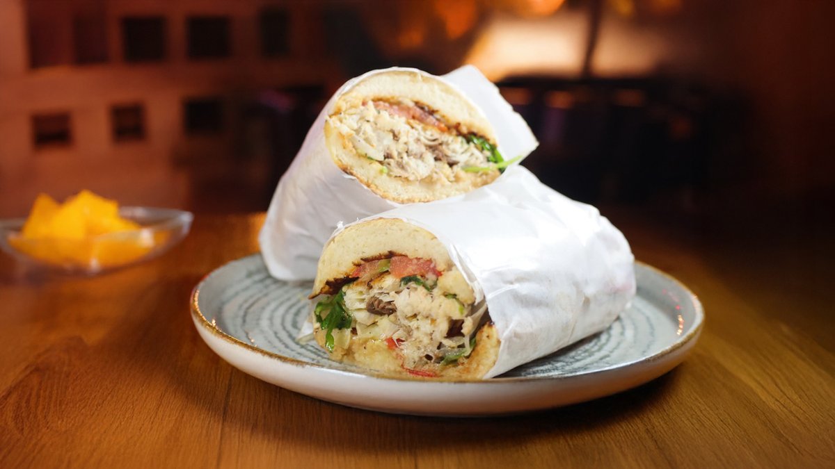 macrou, chifla, salata iceberg, rosie, ceapa rosie, ceapa rosie cu sirop de rodie, sumac, zeama de lamaie + cartofi prajiti - 350g