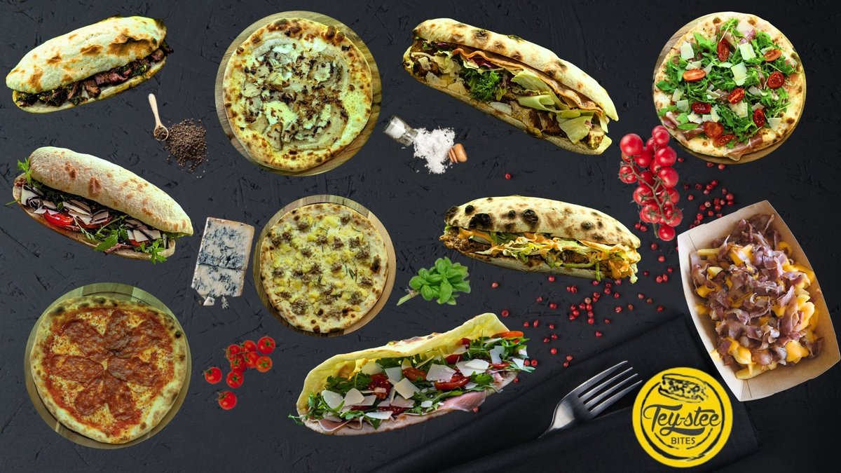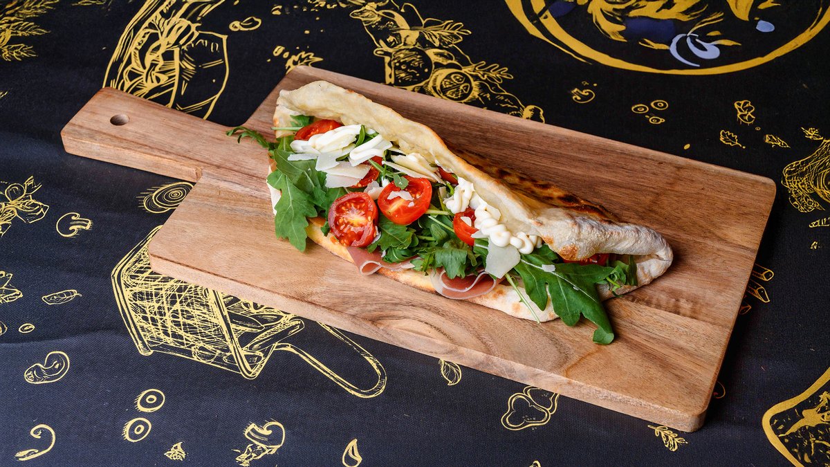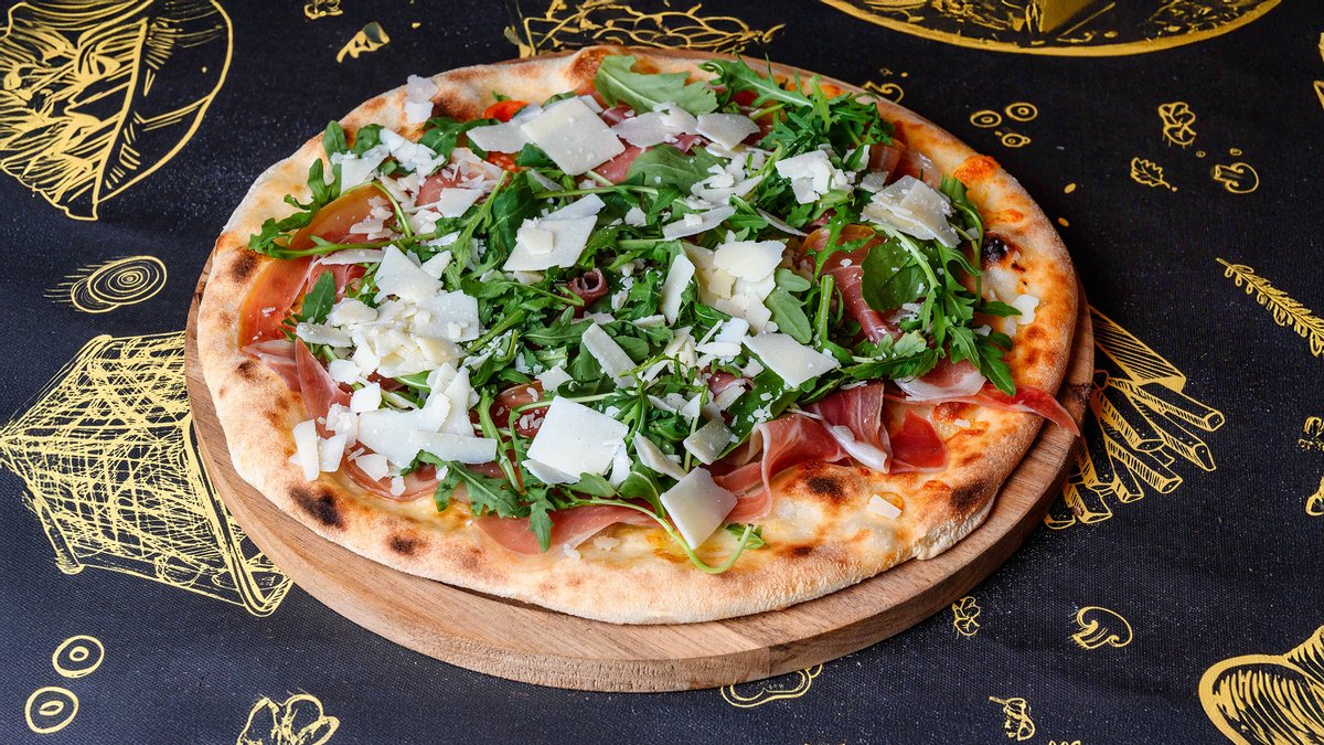 130 gr blat, 40 gr mozzarella, 50 gr mozzarella di buffala, 60 gr proscciuto crudo, 60 gr rosii cherry, 20 gr rucola, 30 gr Grana Padano