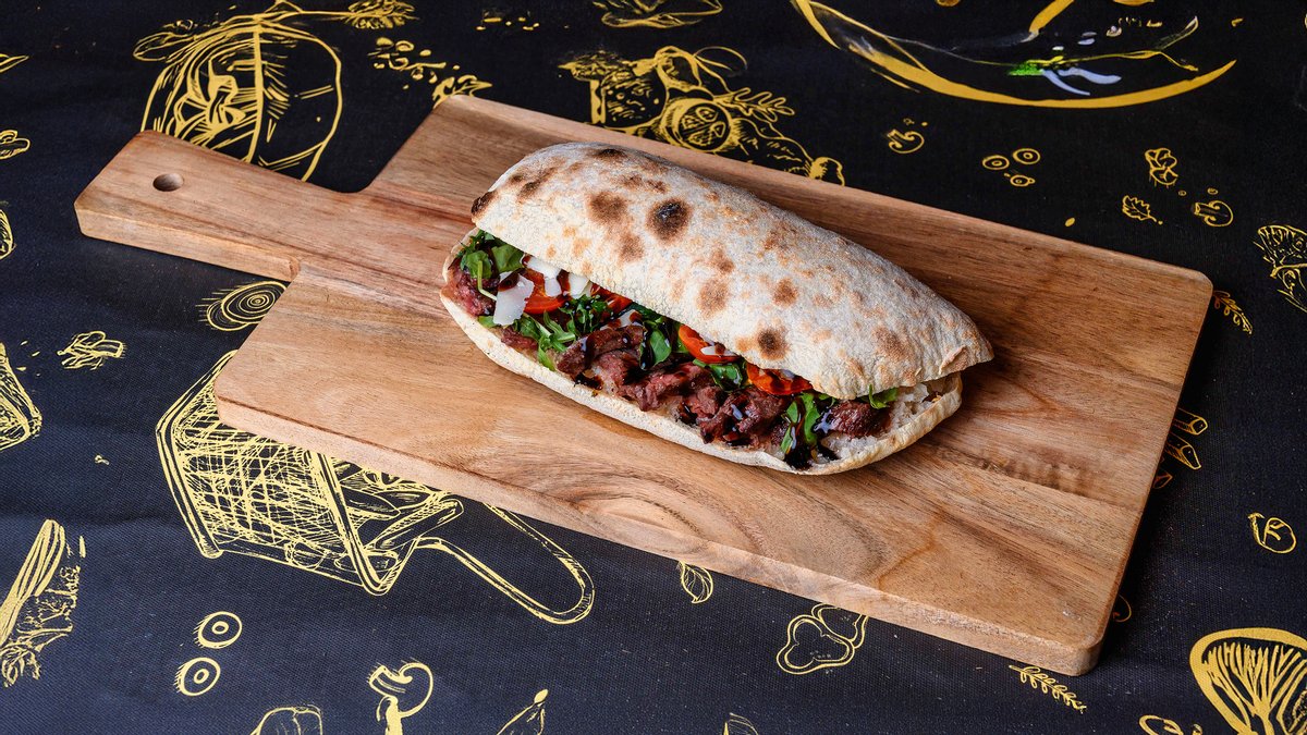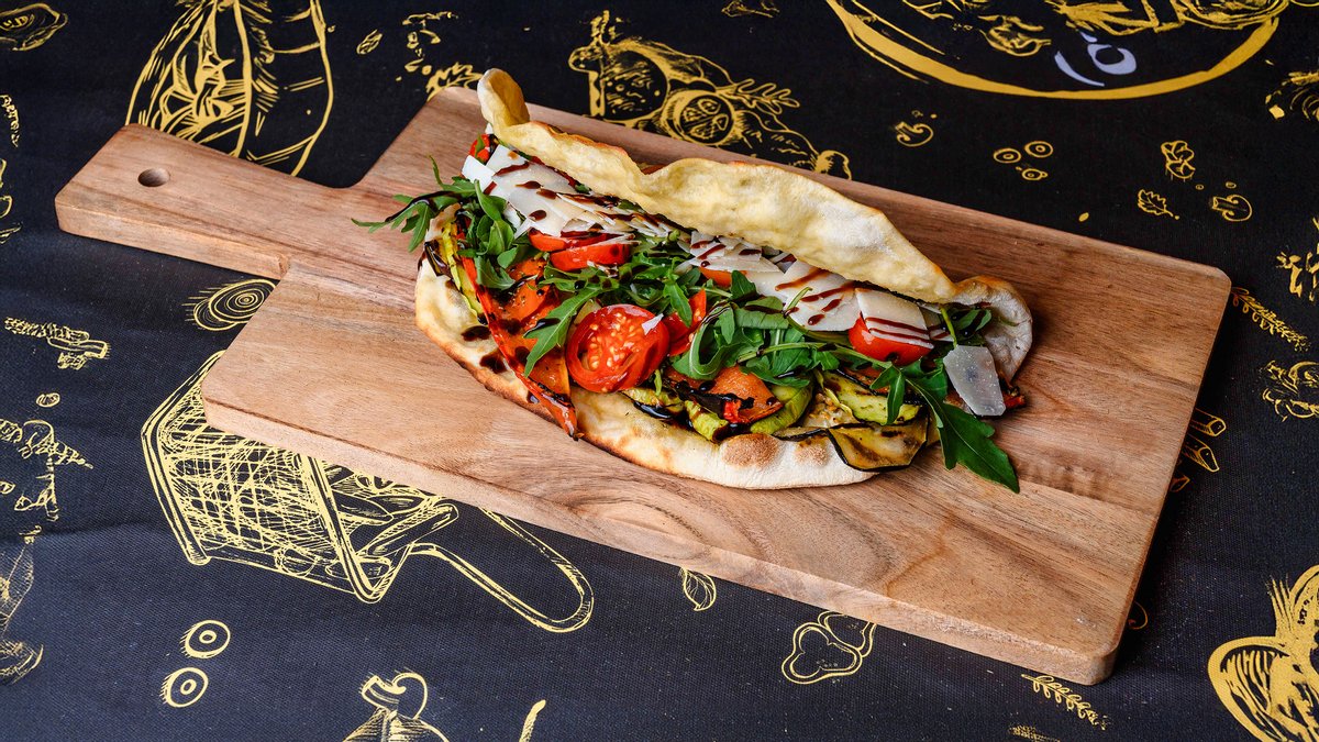 130 gr chifla, 35 gr vinete, 35 gr dovlecei, 35 gr ardei kapia, 20 gr grana padano, 20 gr rosii, 10 gr rucola, 10 gr ceapa verde, 10 gr crema otet balsamic