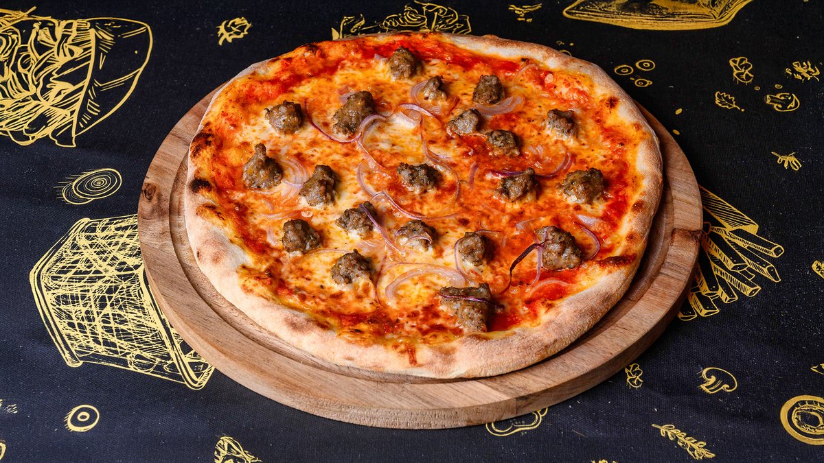 130 gr blat, 60 gr sos pizza, 60 gr mozzarella, 100 gr salsiccia, 30 gr ceapa rosie