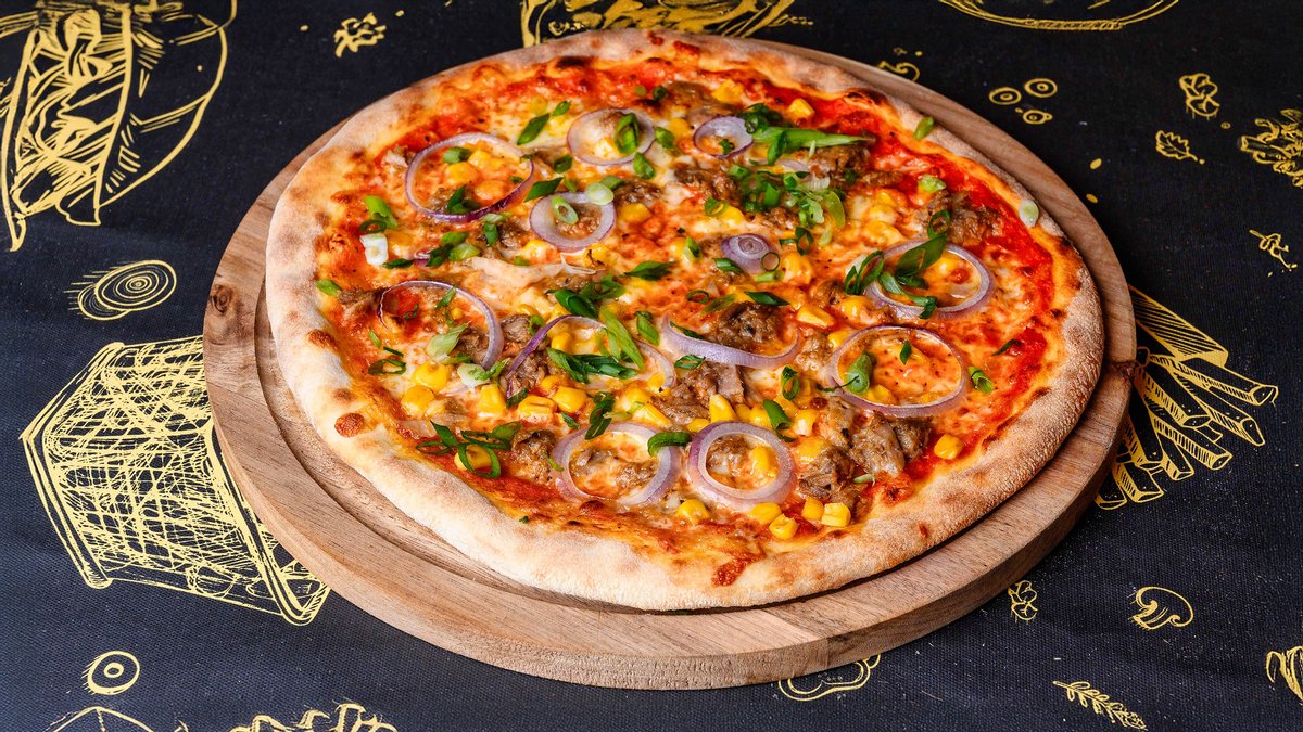 130 gr blat, 60 gr sos pizza, 80 gr ton, 60 gr mozzarella, 40 gr porumb dulce, 30 gr ceapa rosie, 10 gr ceapa verde
