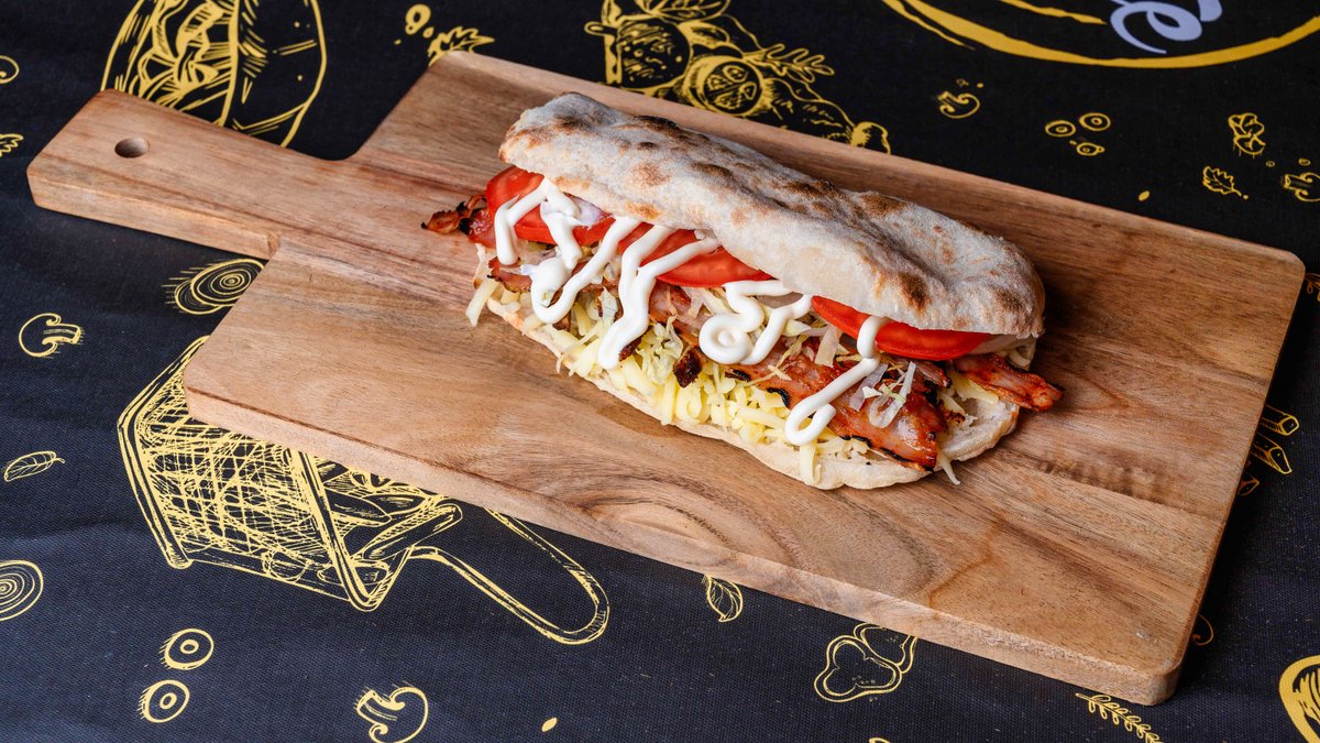 130 gr chifla, 110 gr piept pui, 50 gr mozzarella, 30 gr pancetta, 20 gr salata iceberg, 30 gr rosii, 30 gr sos maioneza - 400 gr
