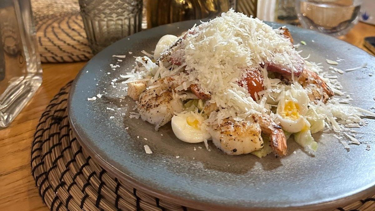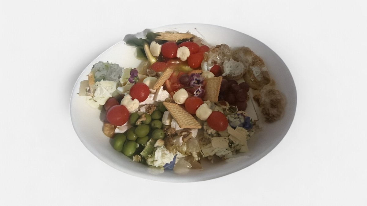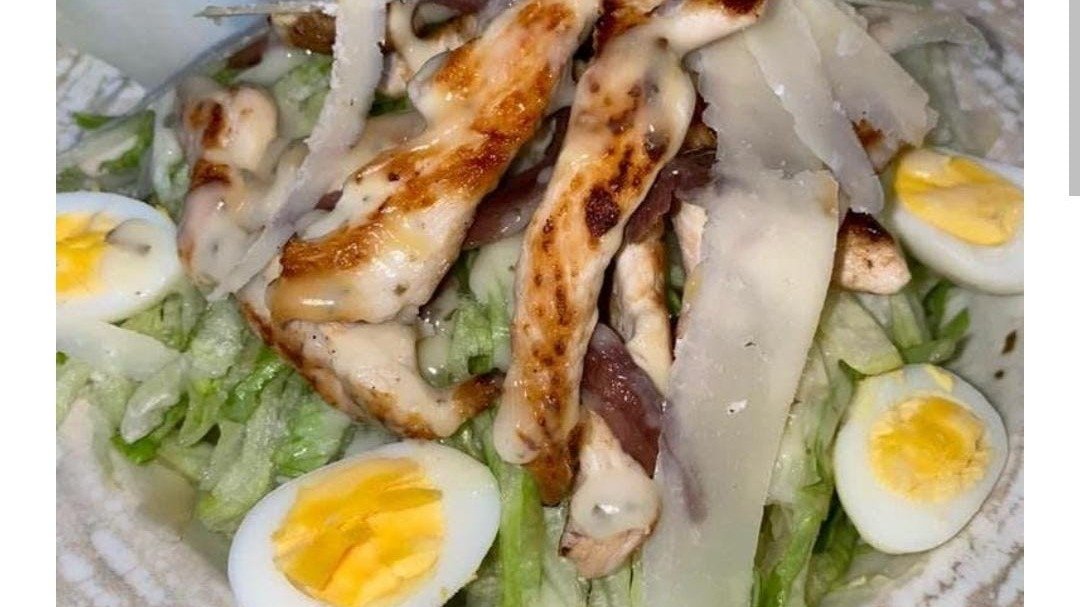 Ouă 195gr, piept de pui 100gr, măsline verzi 50gr, telemea 50gr, iaurt grecesc 30gr, roșii cherry 30gr, ceapă verde 20g, mărar 5g, sos iaurt 50g 530 gr