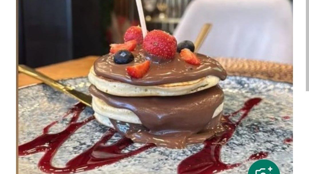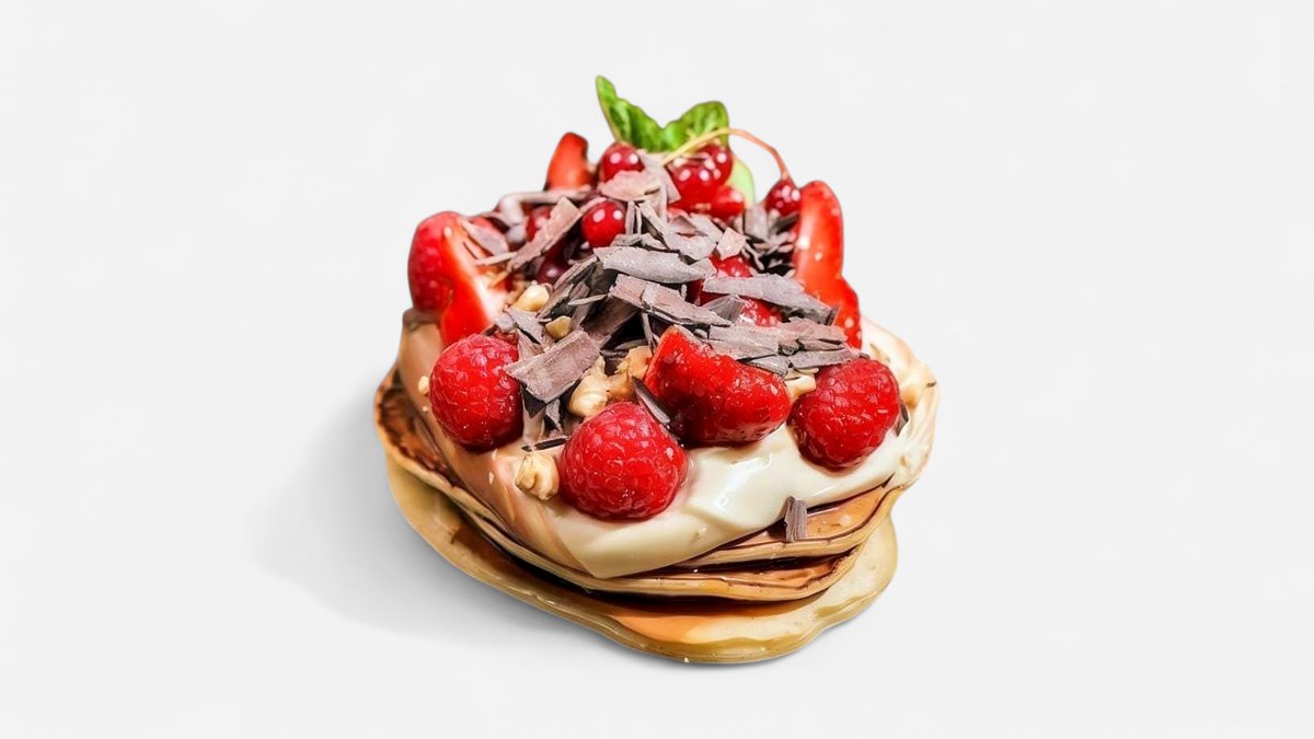 Clătite americane, cremă de mascarpone, dulceață de fructe de pădure, fructe, nucă, ciocolată neagră și căpșuni 400gr