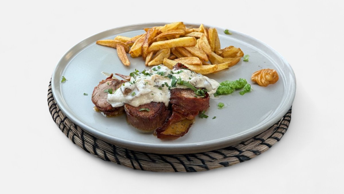 Muschiulet de porc cu sos de ciuperci in crusta de bacon cu piure - cartofi prajiti