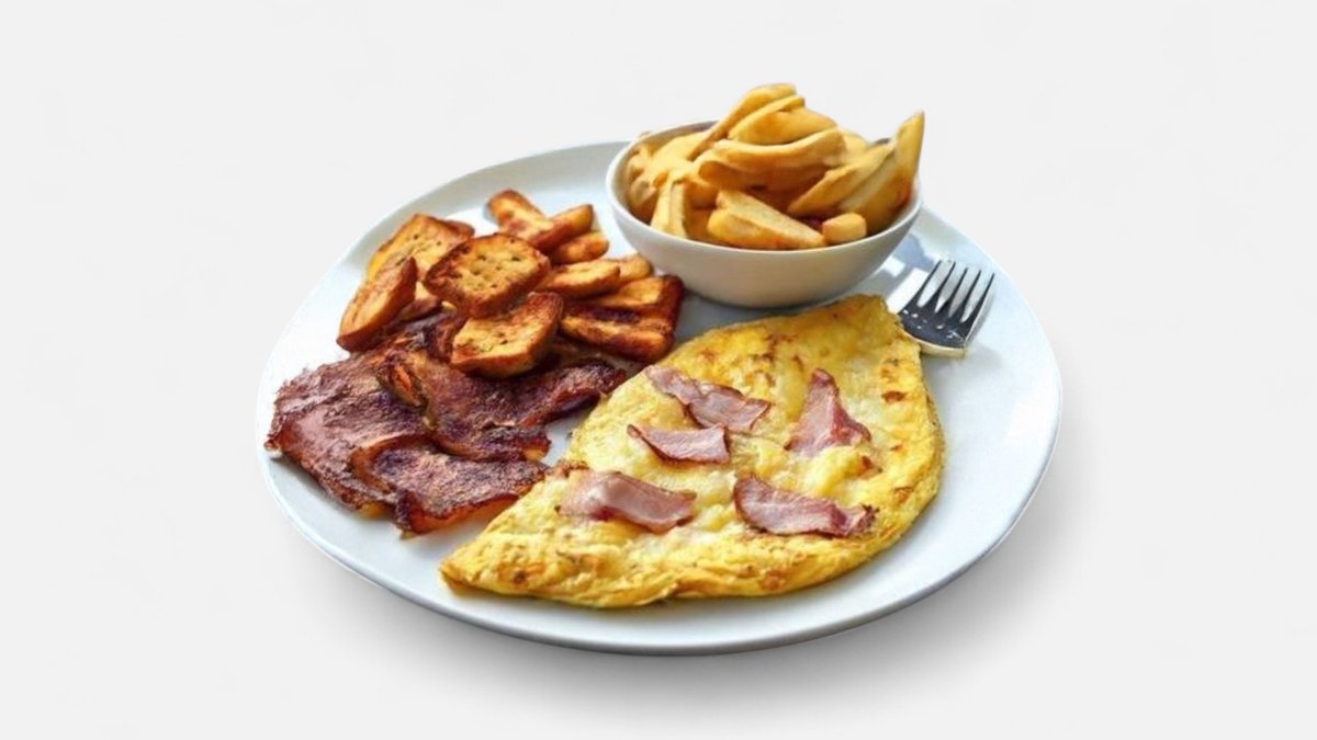 Ouă 195gr, bacon 50gr, ciuperci champignon 30gr, ardei gras roșu 30gr, cașcaval 30gr 335 gr
