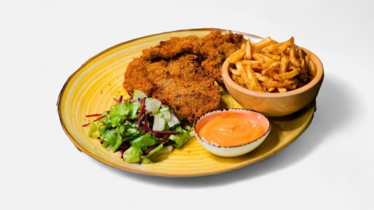 Făină, ouă, carne vițel, cartofi prăjiți 300 gr