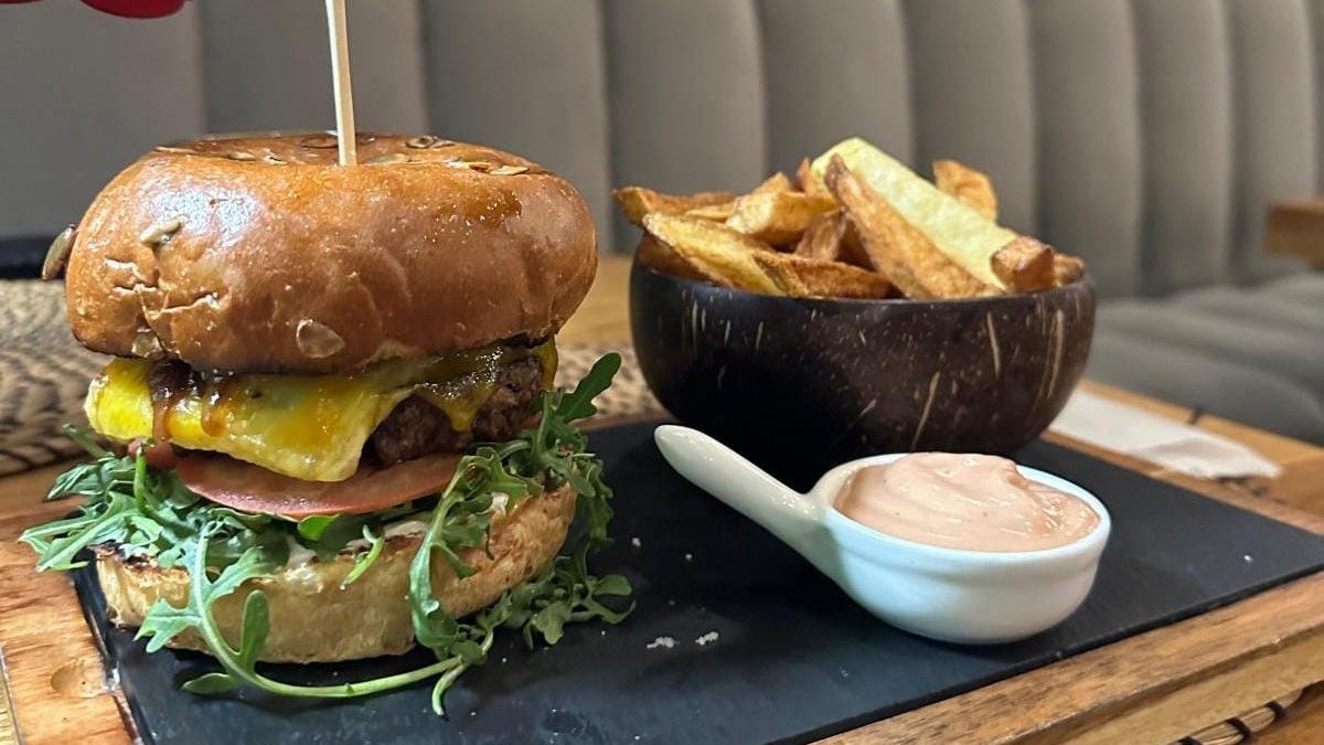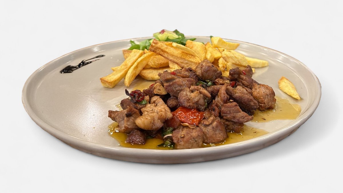 Ceafă de mangaliță gătită în unt, usturoi, vin, cimbru și servită cu cartofi prăjiți