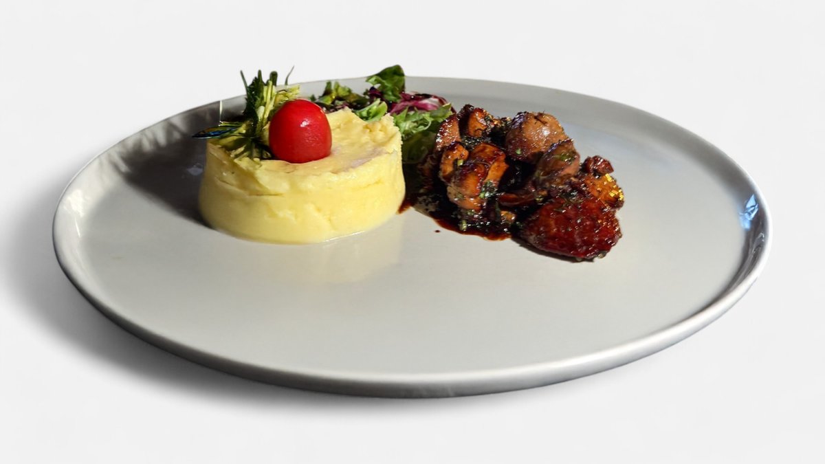 Ficăței de pui, piure de cartofi, ceapă, usturoi și sos de rodie 250gr