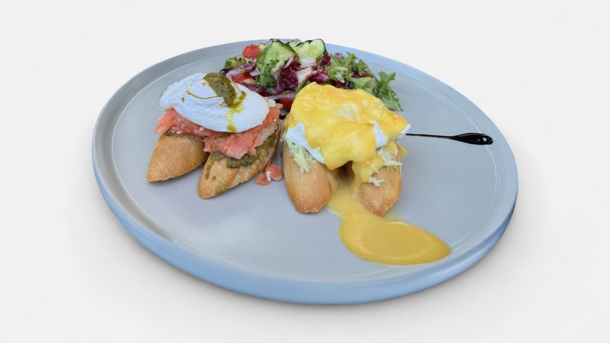 Ouă 130gr, Avocado 80gr, pâine toast 60gr, salată mediteraneeană 50gr, sos olandez 30 ml 350 gr