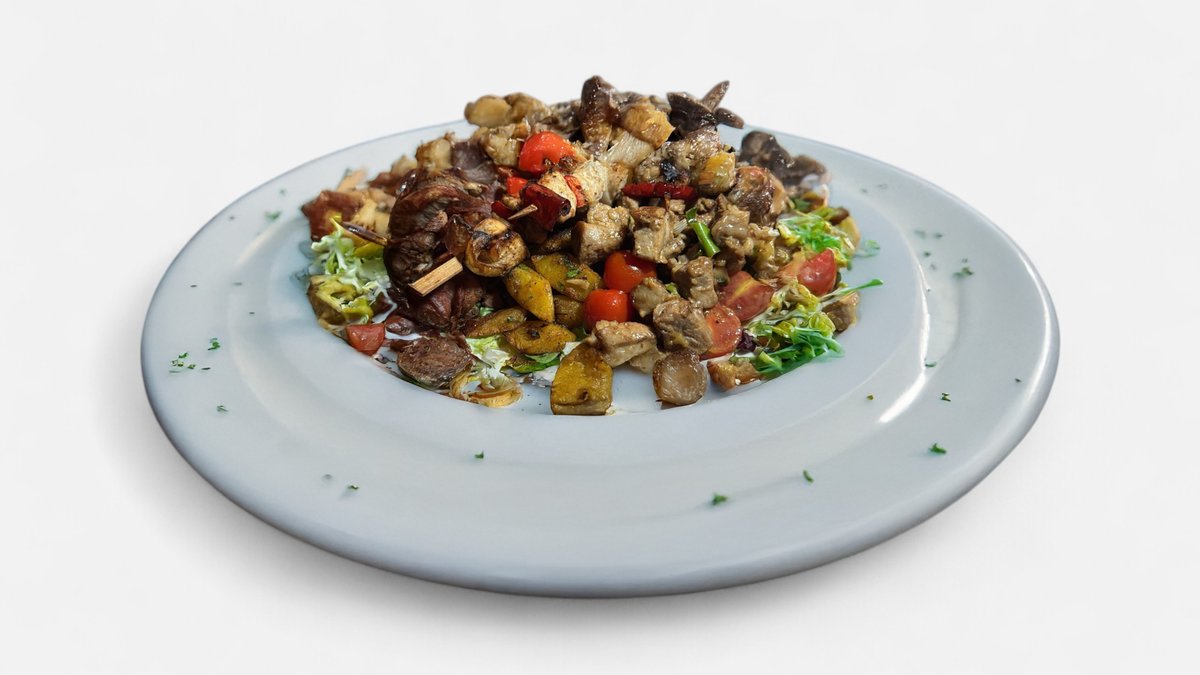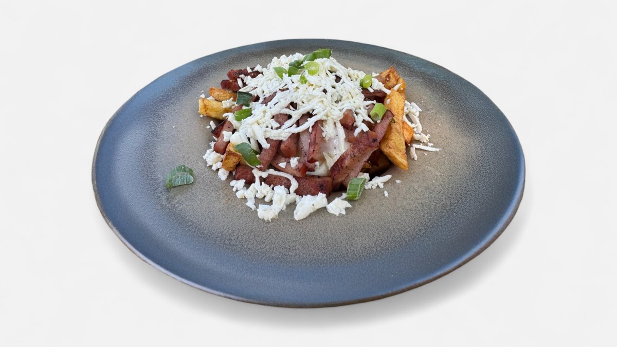 Ouă 130gr, cartofi 100gr, roșii 50gr, cârnați afumați 50gr, bacon 50gr, telemea 30gr, ciuperci champignon 30gr, fasole roșie 20gr 460 gr