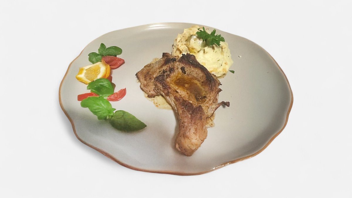Cotlete de berbecuț, vin, unt, usturoi, piure de cartofi și ierburi aromate 350 gr