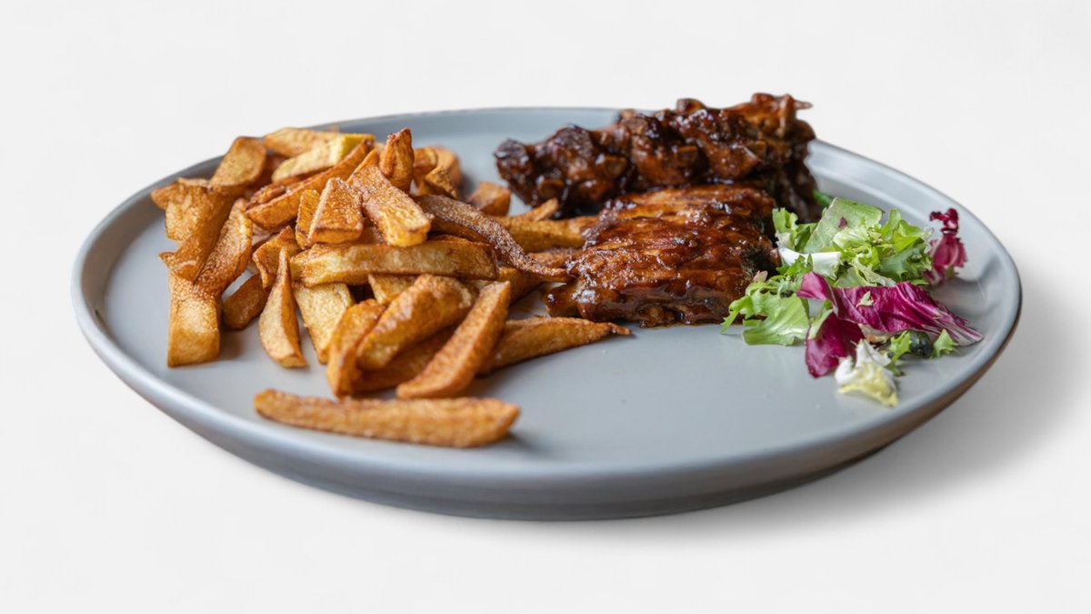 Coastă de porc cu sos BBQ si cartofi prăjiți