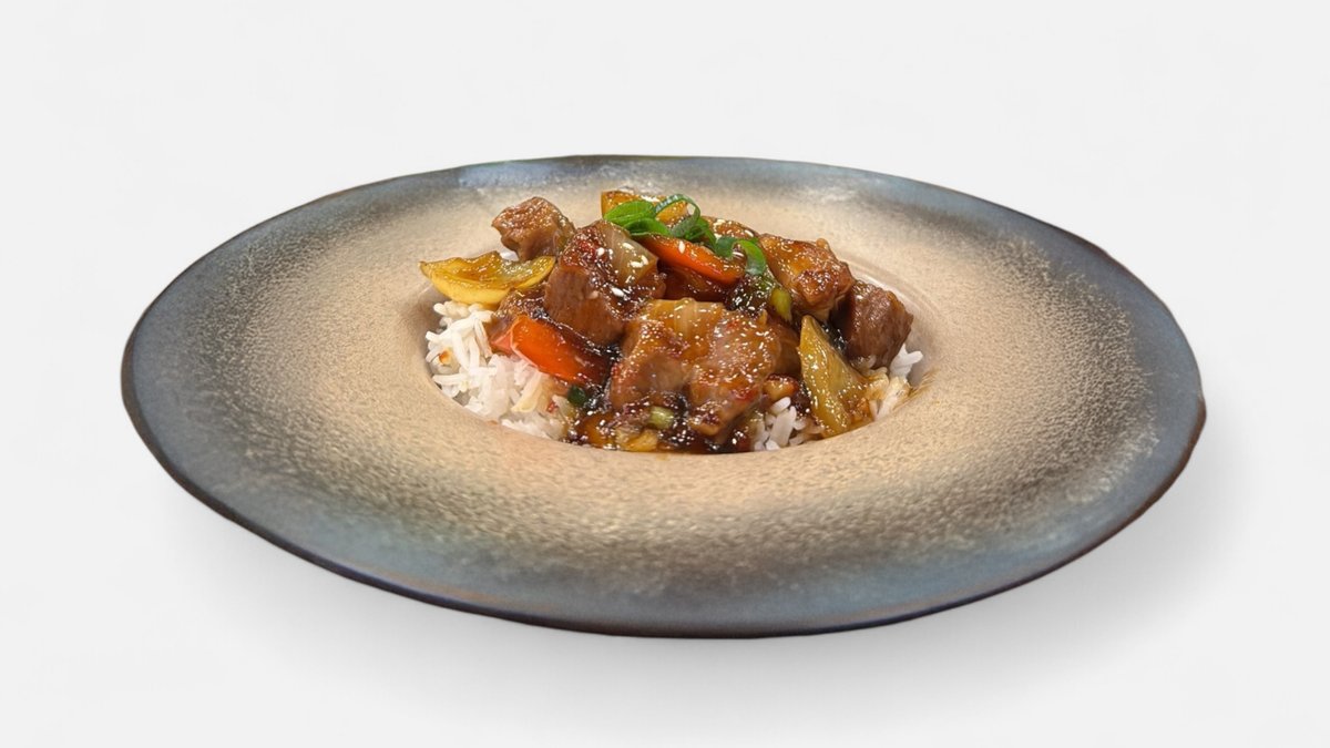 Piept de pui, ardei 3 culori, ciuperci, sos Napoli, sweet chilli