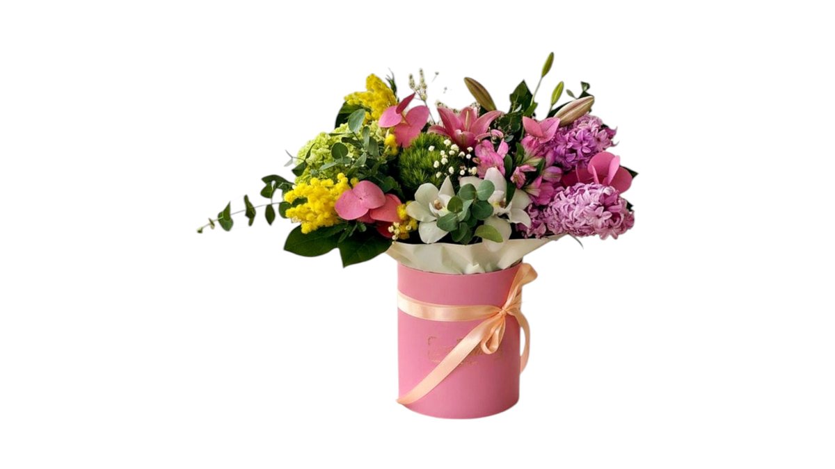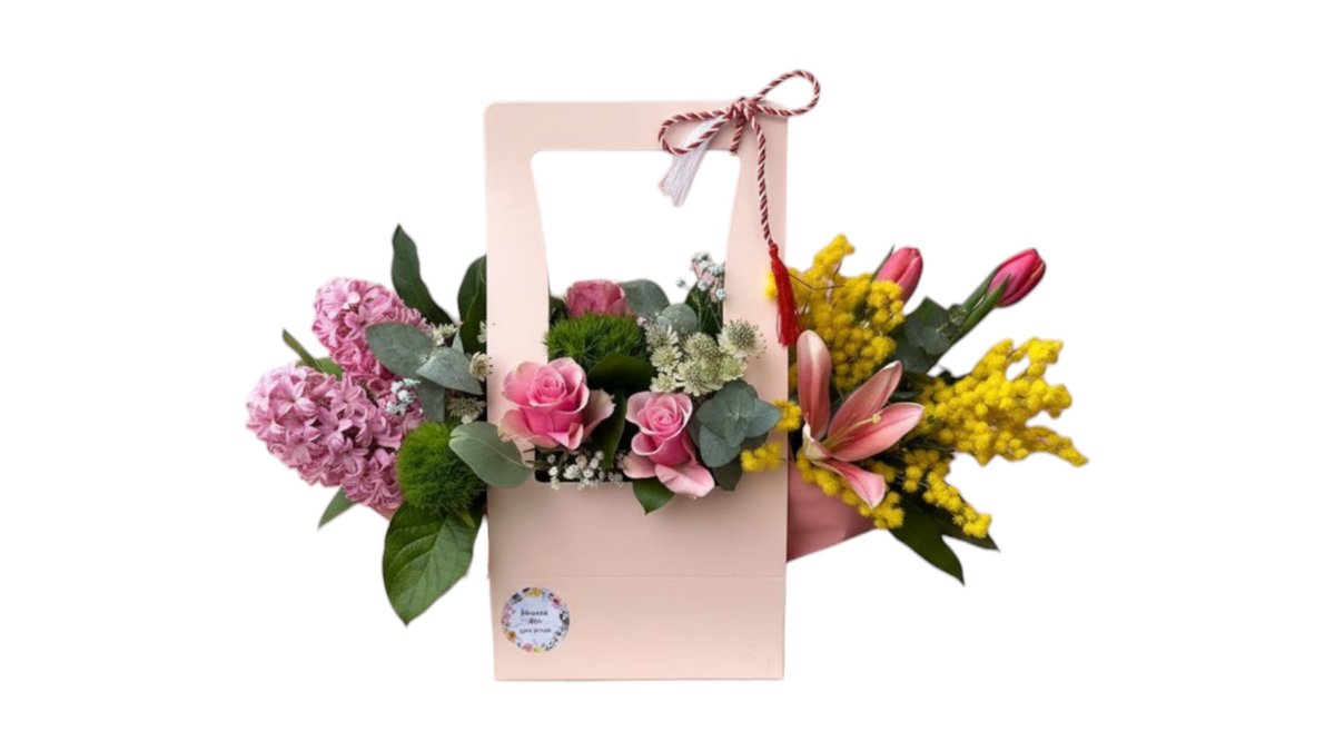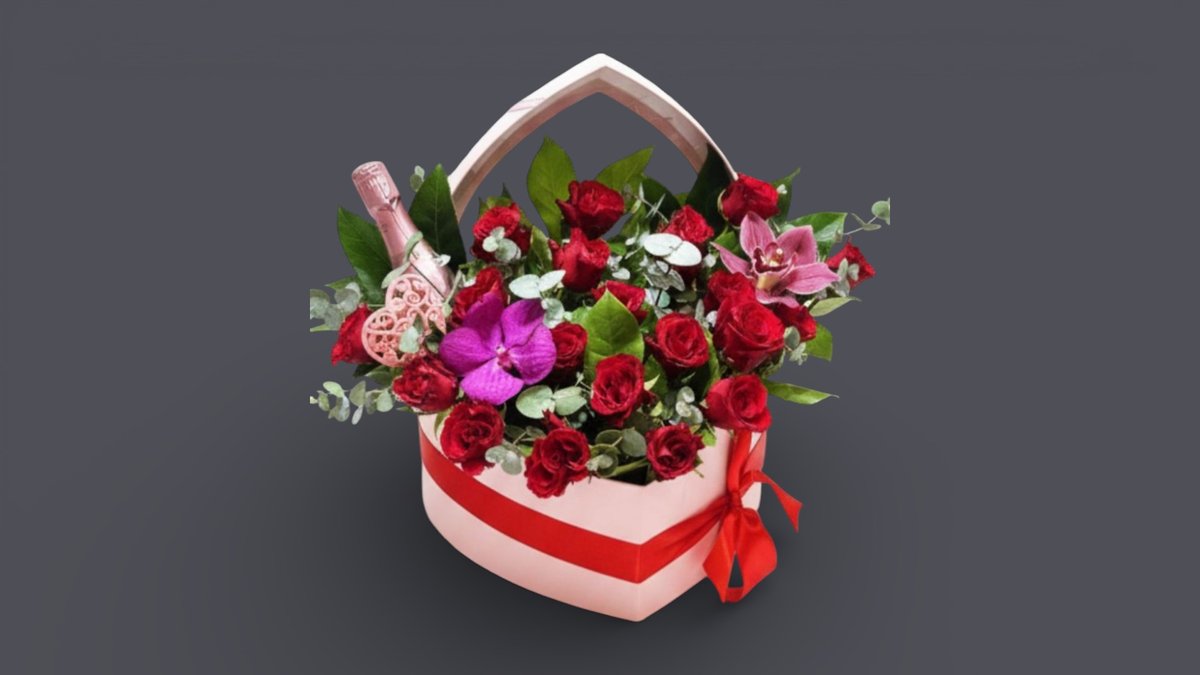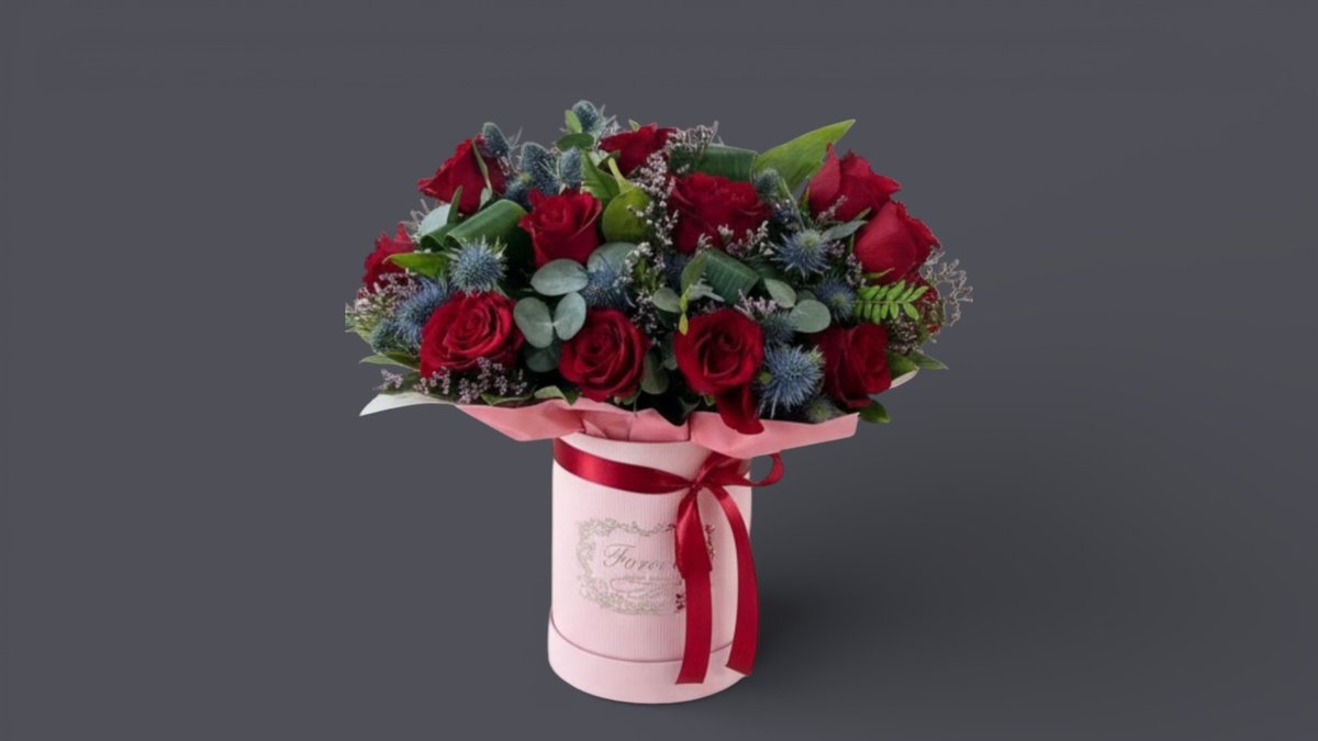 Aranjament 11 trandafiri roșii cu alte flori decorative și cutie