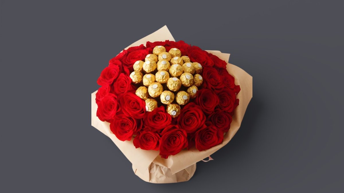 Buchet 35 trandafiri roșii și bomboane Ferrero Rocher cu aranjament