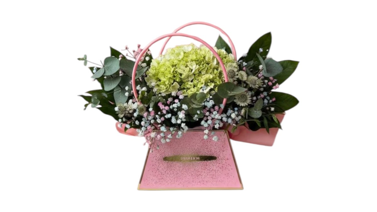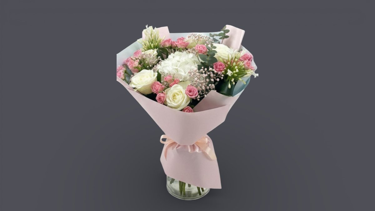 Buchet din 1 hortensie, 5 trandafiri albi, 5 tros și aranjament