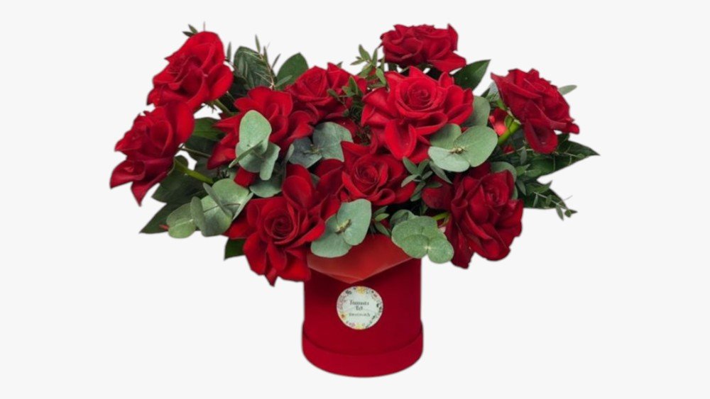 Cutie catifelata cu 11 trandafiri rosii + verdeata decorativa