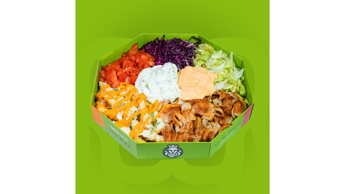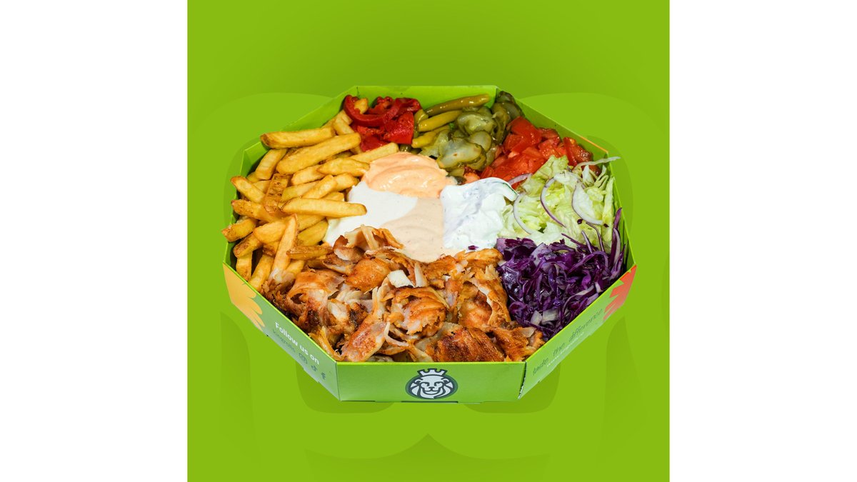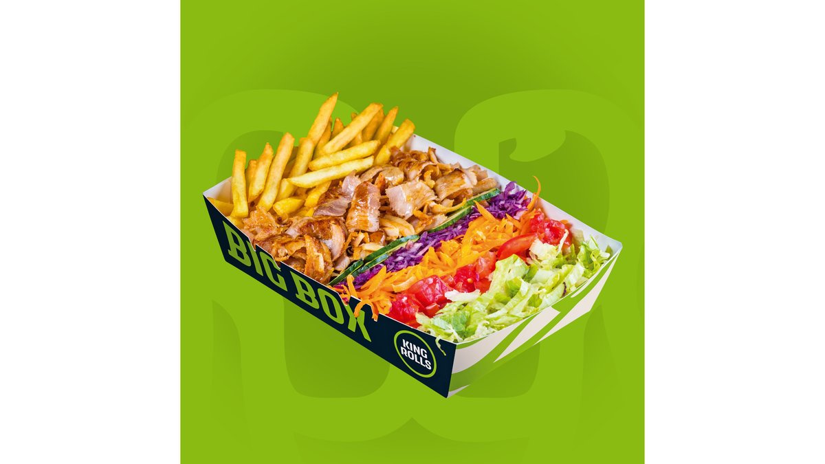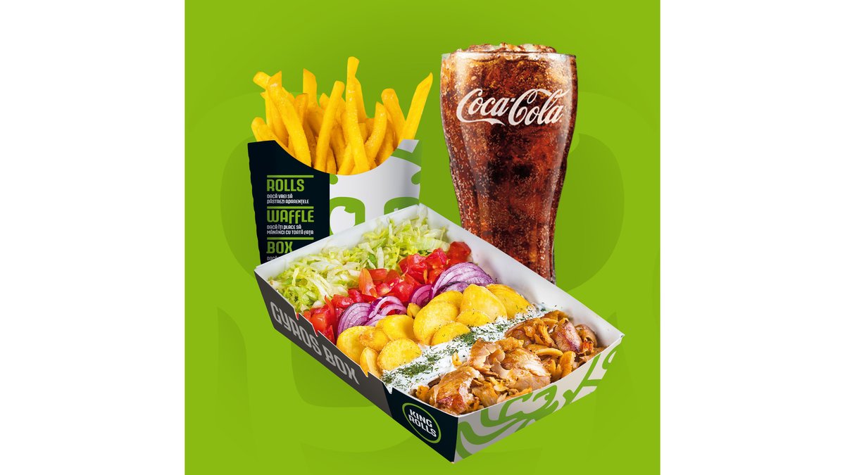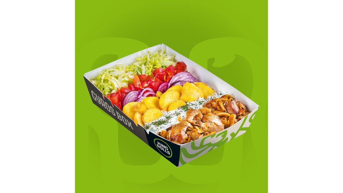 Carne rotisată, salată iceberg, varză roșie, morcovi, roșii, castraveți, cartofi prăjiți sau orez și sos King Rolls, se serveste cu lipie grecească. Băutură și cartofi prajiți/dippers.