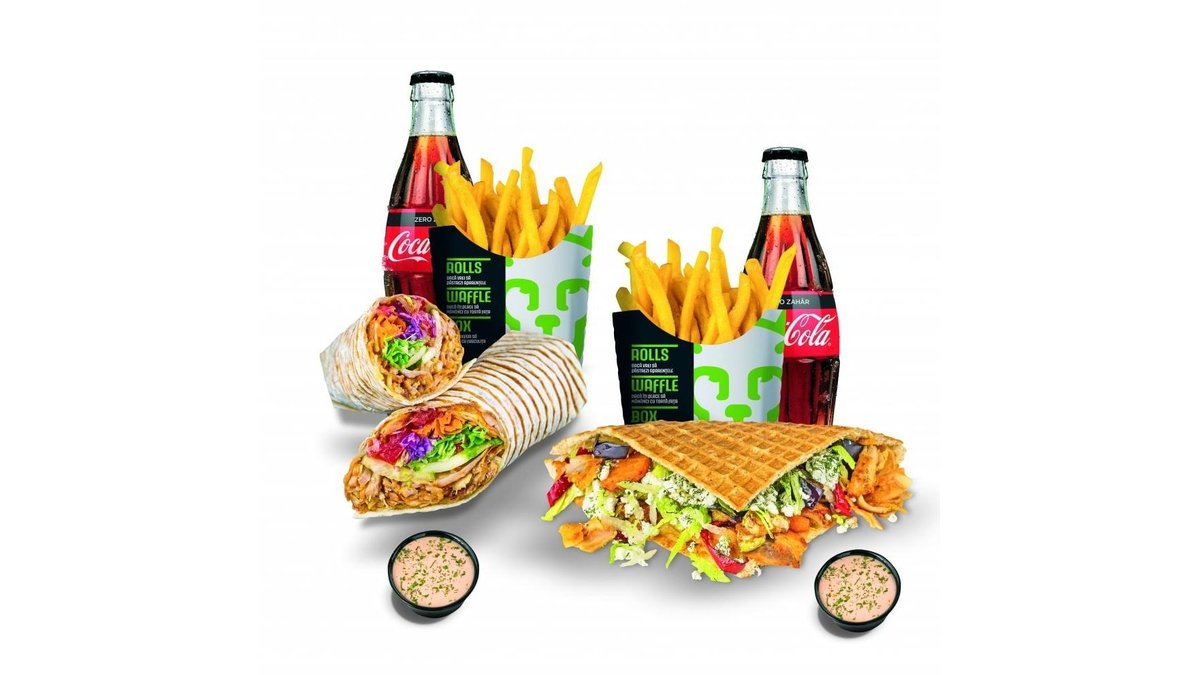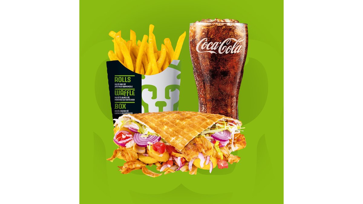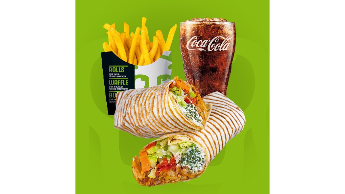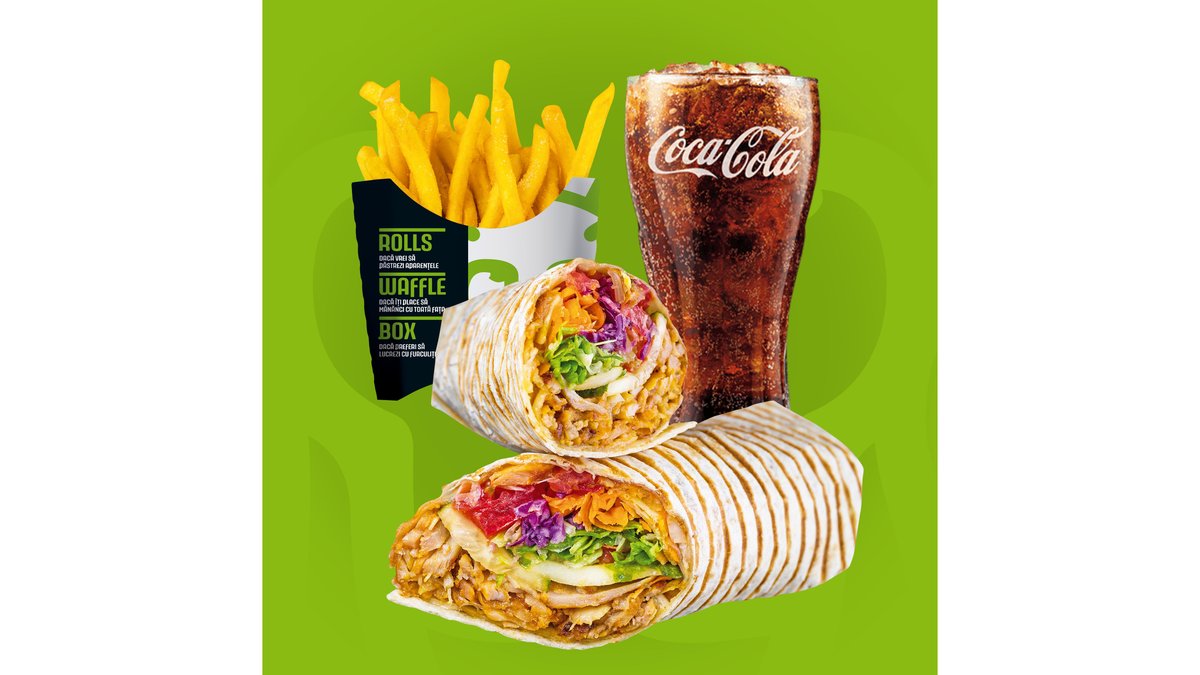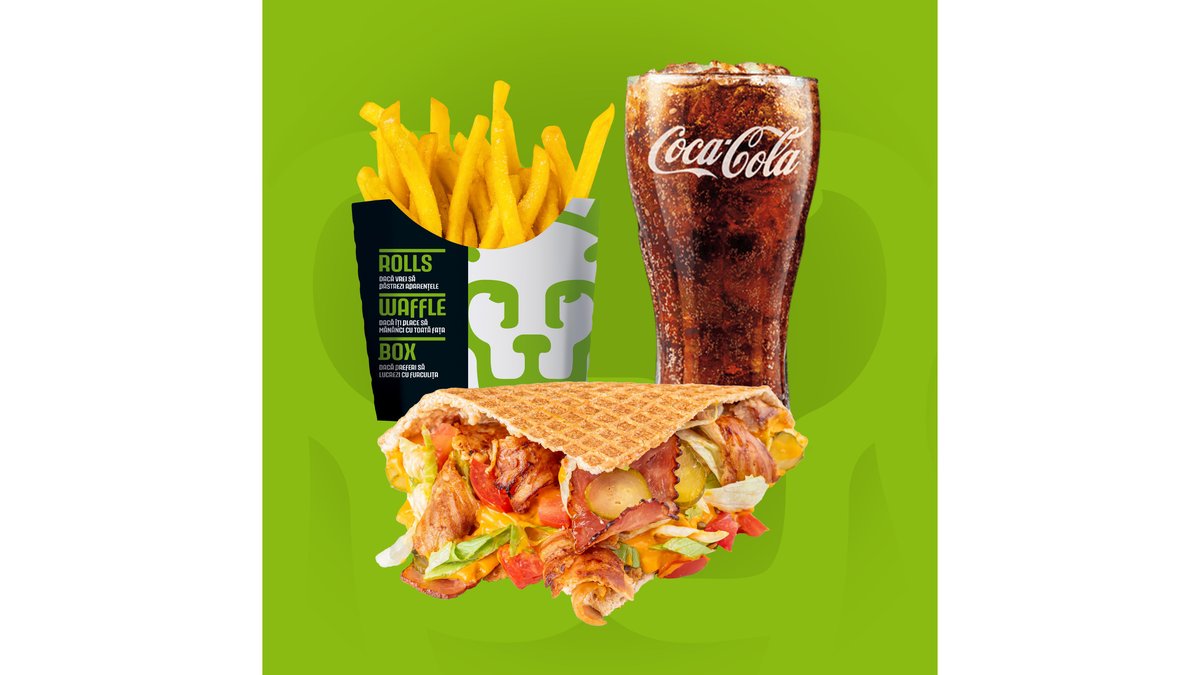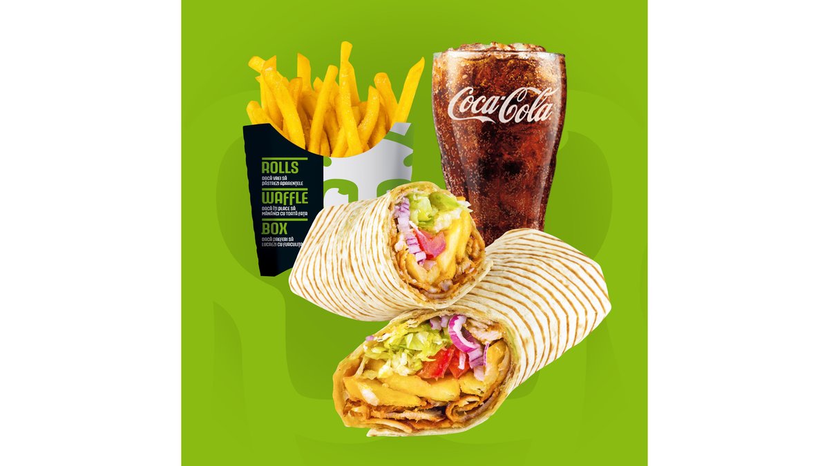 Meniul cuprinde 1x Rolls, 1x Waffle, 2x băuturi, 2x cartofi prăjiți, 2x sosuri King Rolls. Poți alege mărimea sandviș-urilor medie sau mare și tipul de carne.