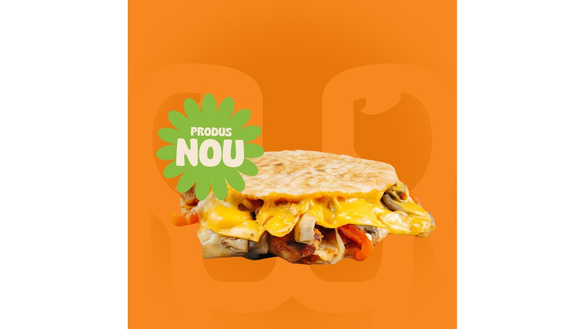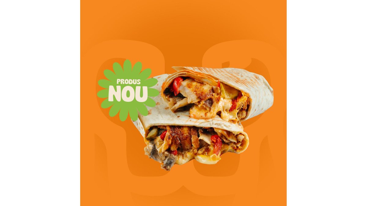 Crispy pita, carne rotisata, cartofi rondele, ciuperci sotate cu ceapa, ardei copti, castraveti murati, mozzarella, cedar si sos de ardei putin picant.
