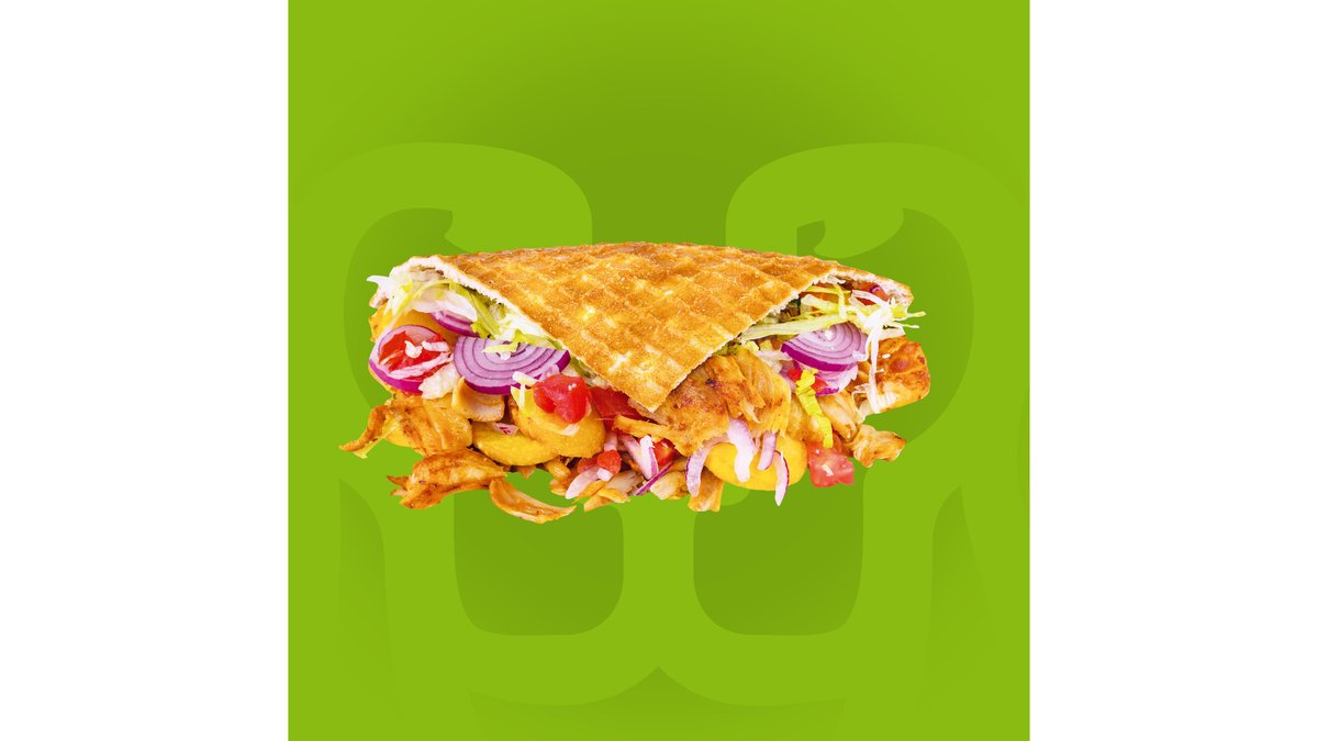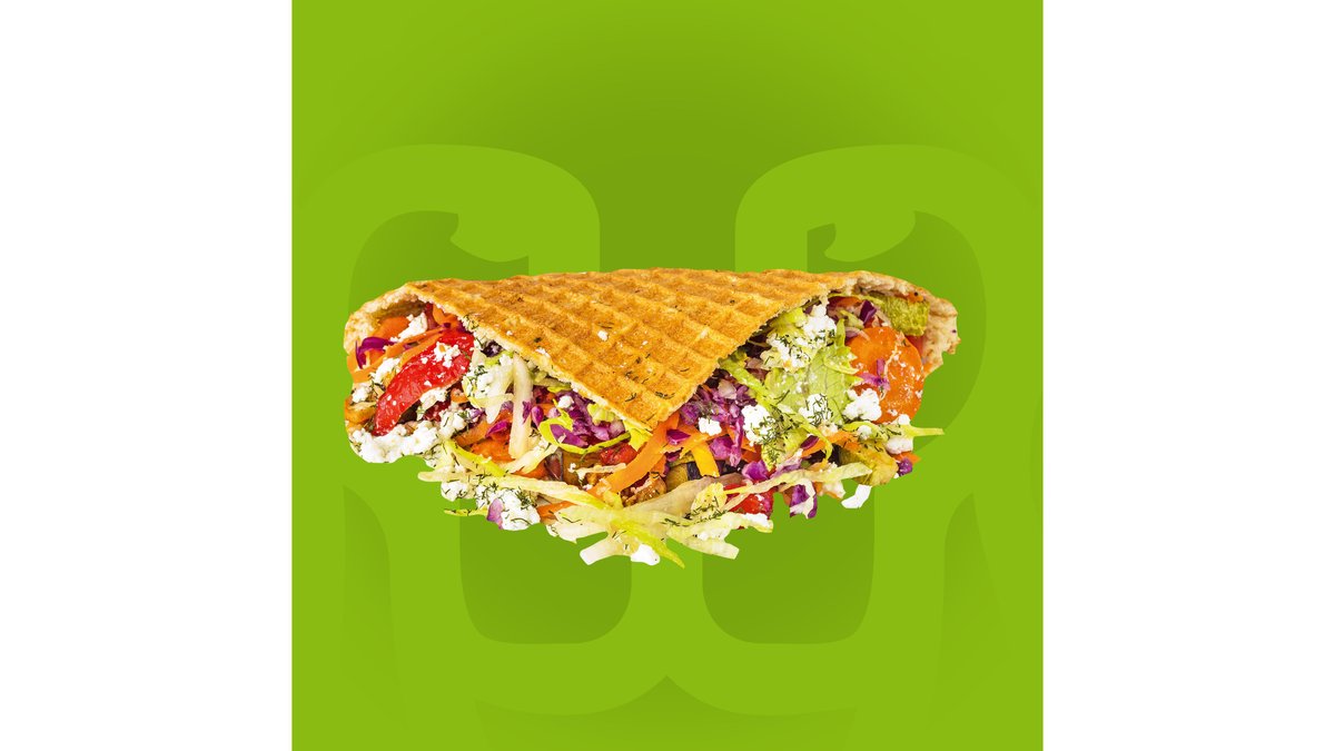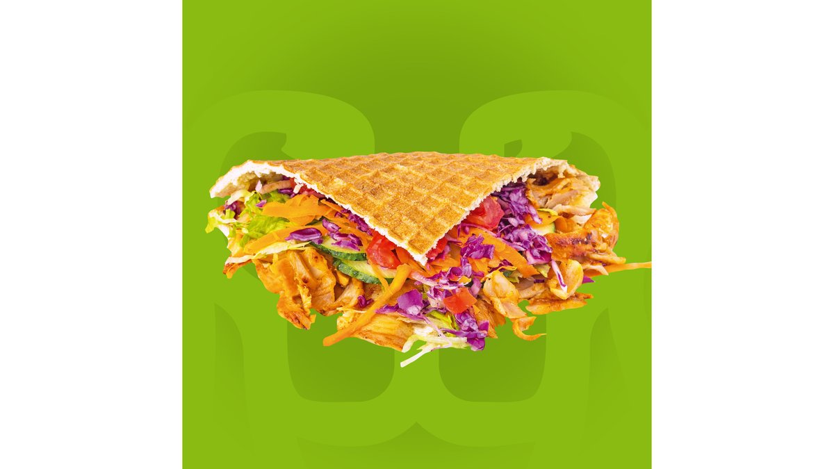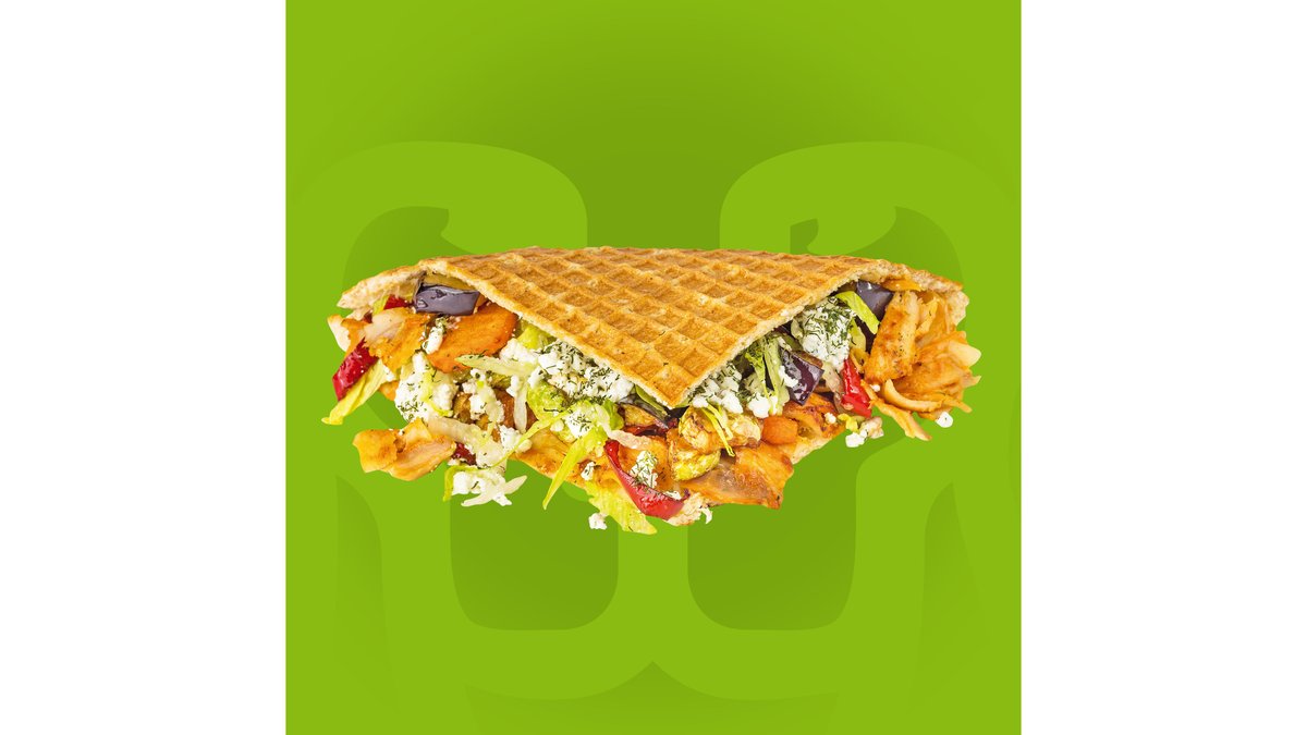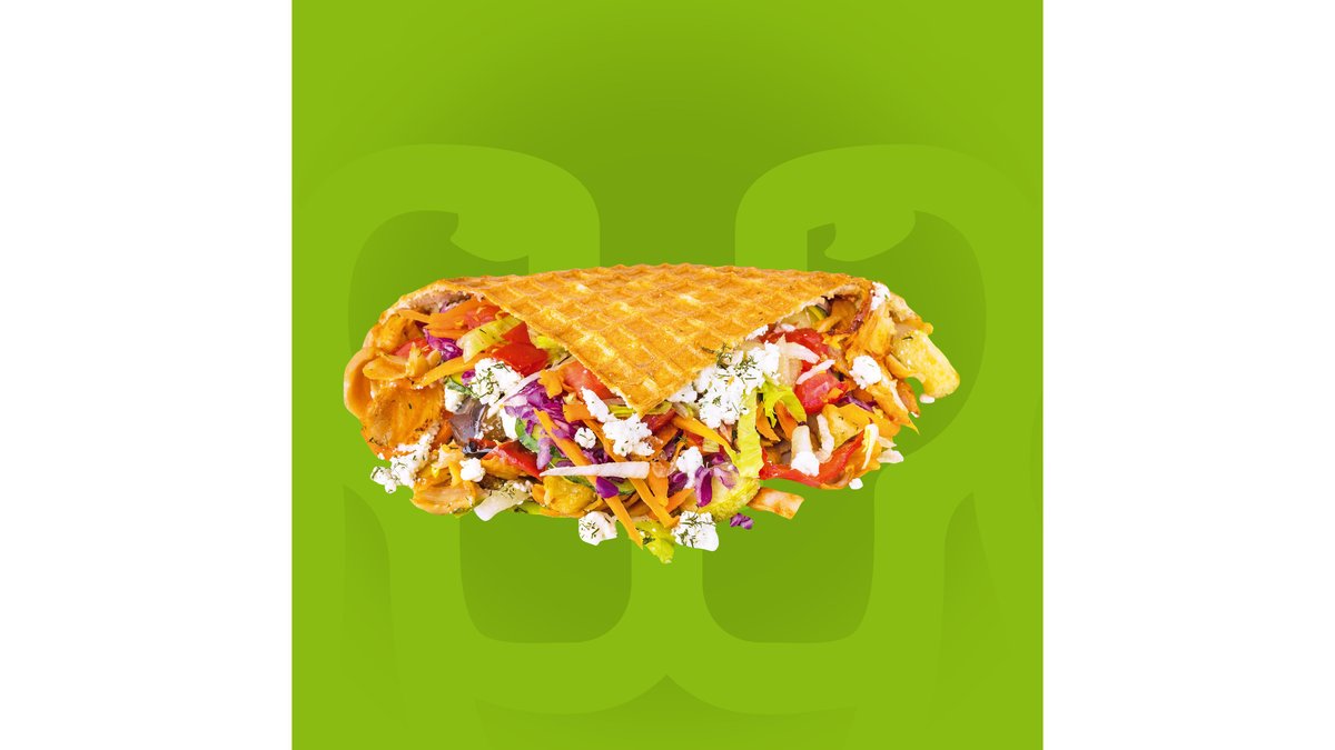 Crispy waffle, carne rotisată de pui, curcan si vitel, salată iceberg, vinete, dovlecei, ardei la cuptor, brânză Feta, roșii, castraveți, varza roșie, morcov și sos de iaurt. 400gr