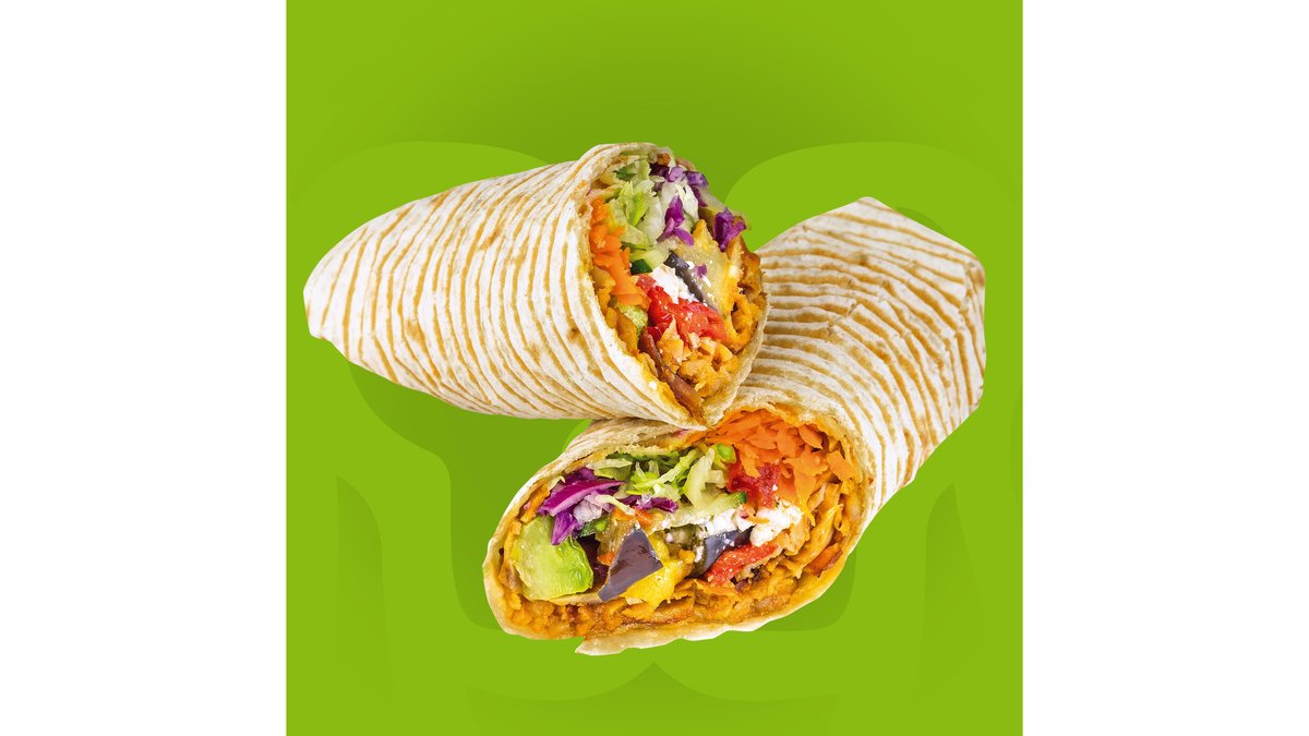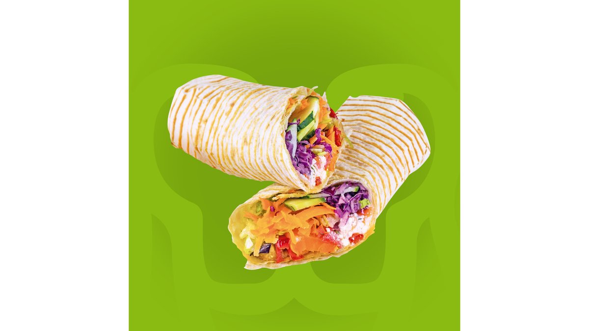 Lipie crispy, salată iceberg, varză roșie, morcov, roșii, castraveți, vinete, dovlecel, cartofi și ardei la cuptor, branză Feta și sos de iaurt.