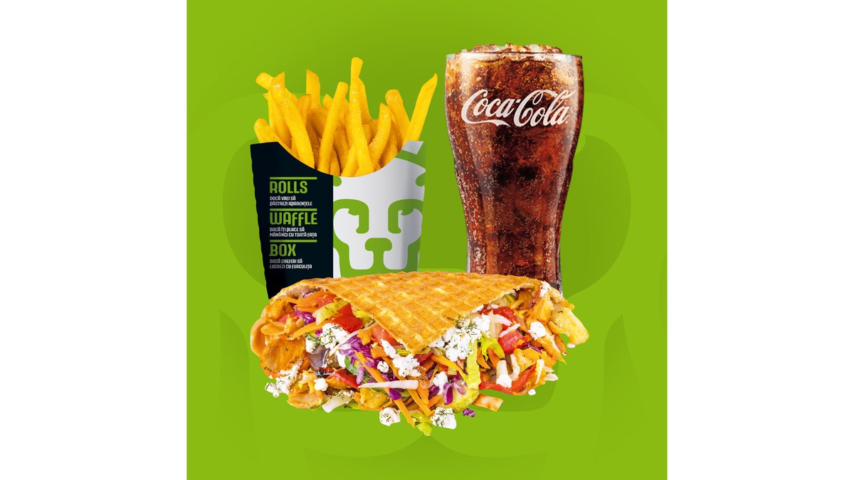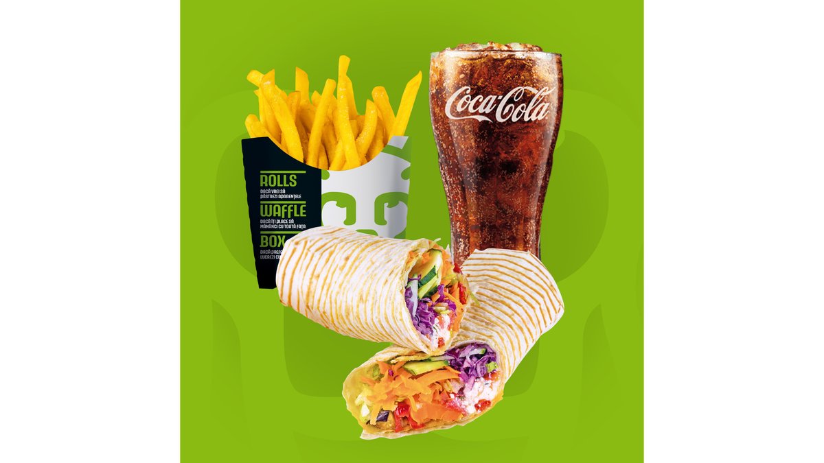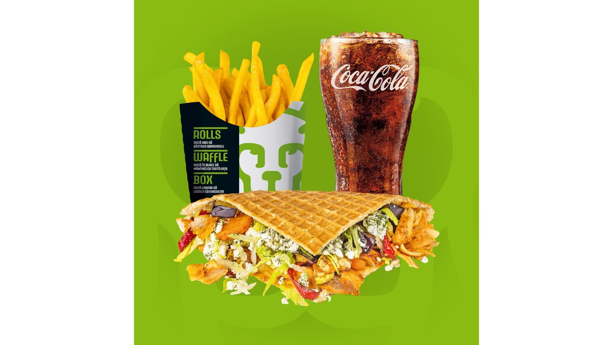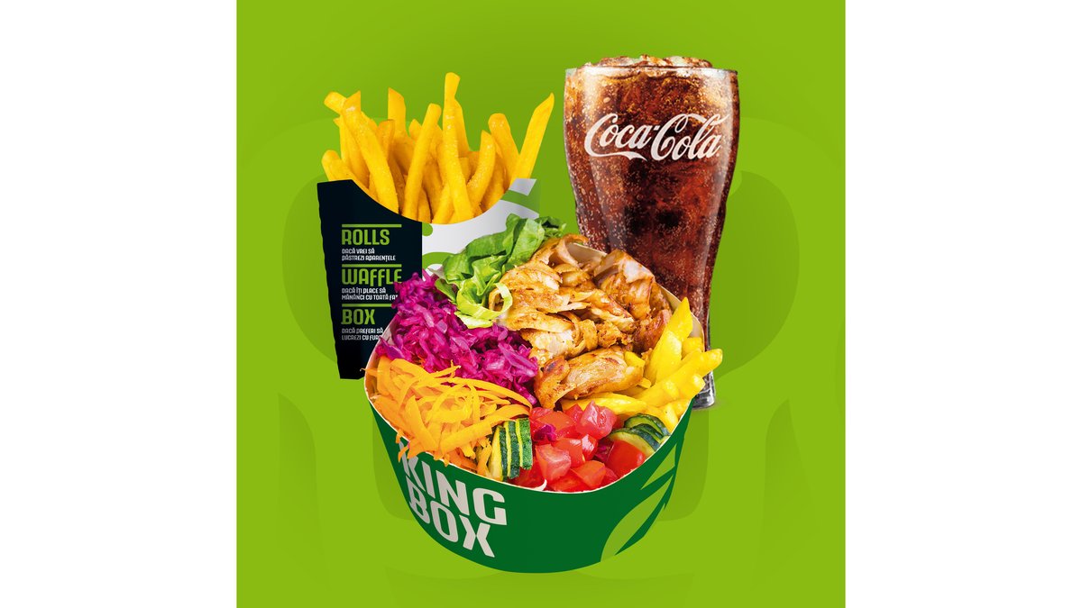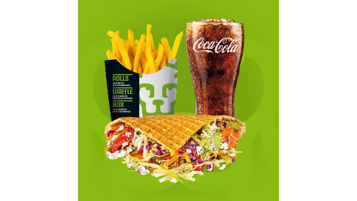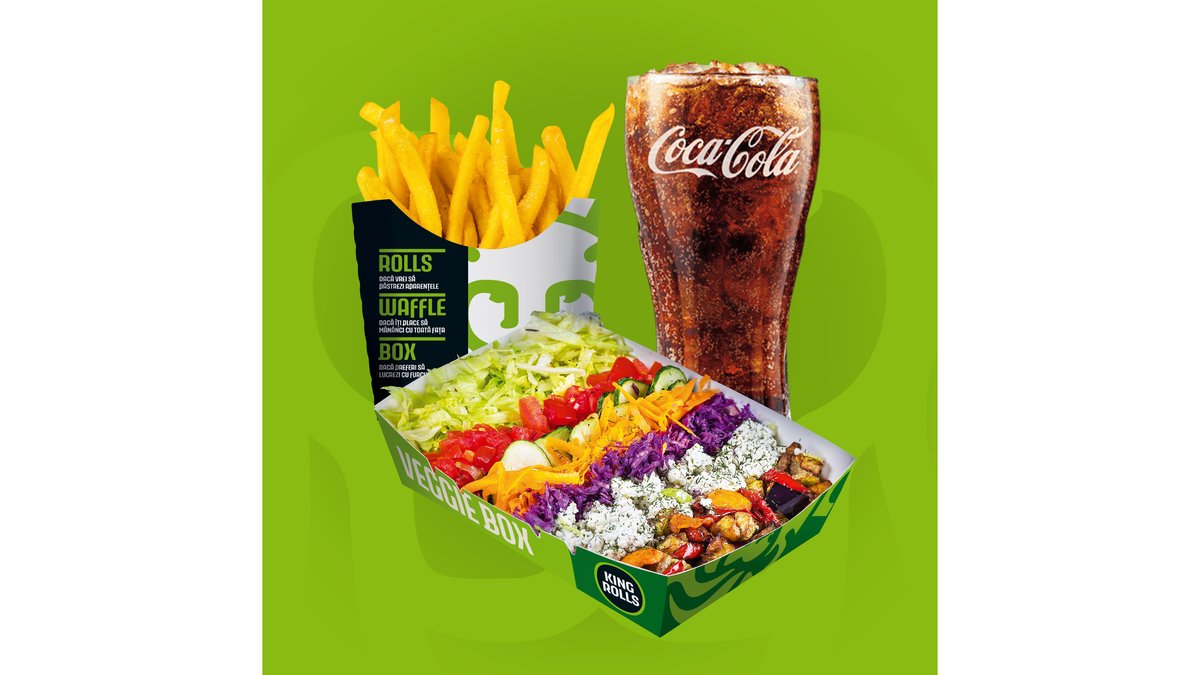 Crispy waffle, salată iceberg, varză roșie, morcov, roșii, castraveți, vinete, dovlecei, ardei, cartofi la cuptor, brânză Feta și sos King Rolls. Bautura si cartofi prajiti/dippers.