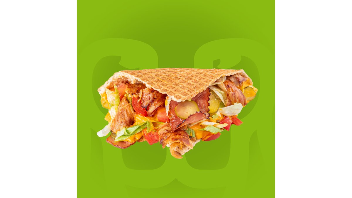Crispy waffle, carne de pui și curcan sau curcan și vițel, bacon, cartofi prăjiti, roșii, salată iceberg, castraveți murați, sos nachos și sos King Rolls.