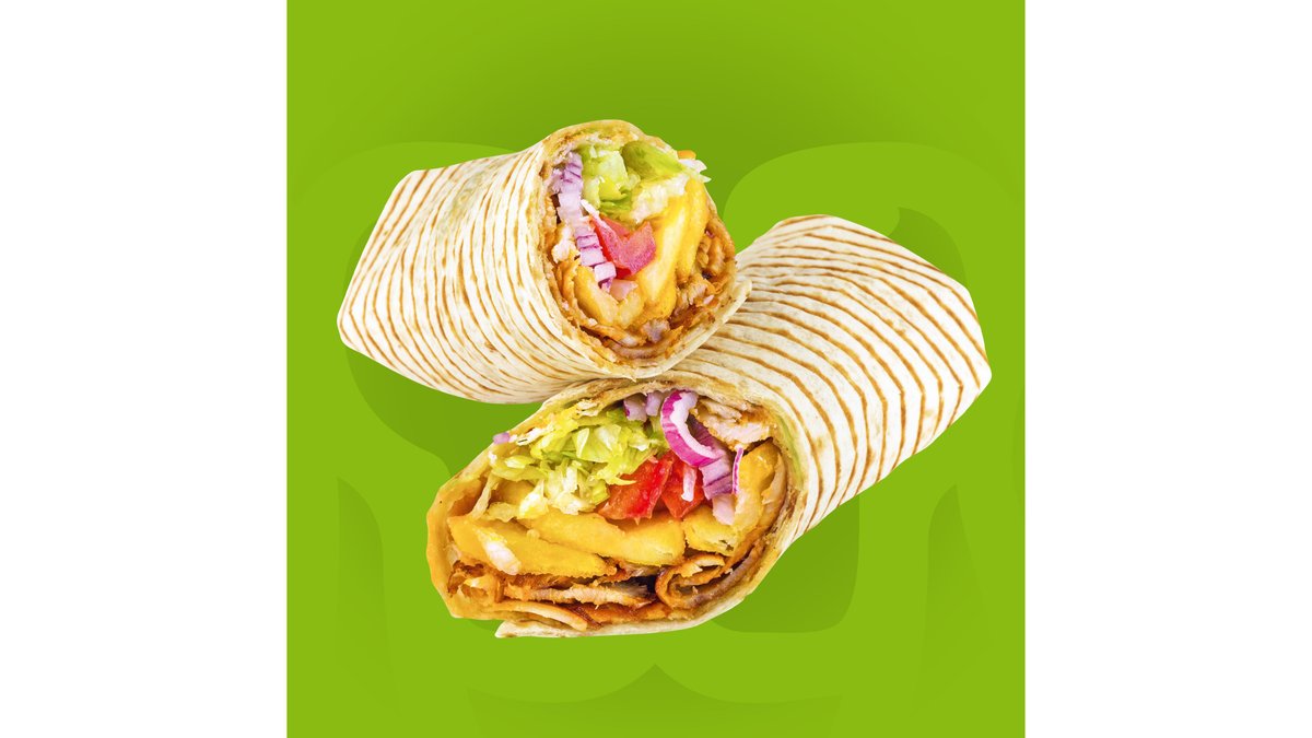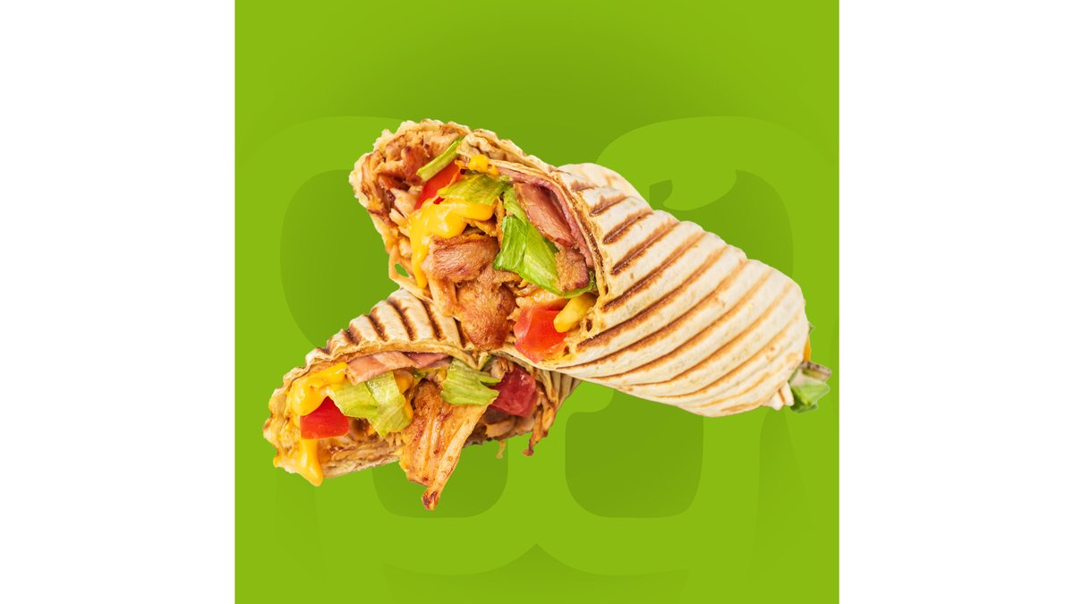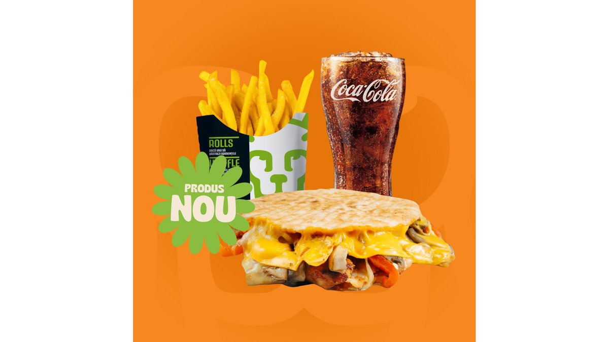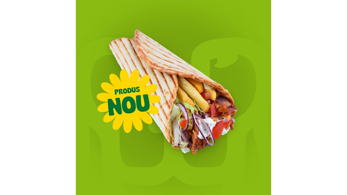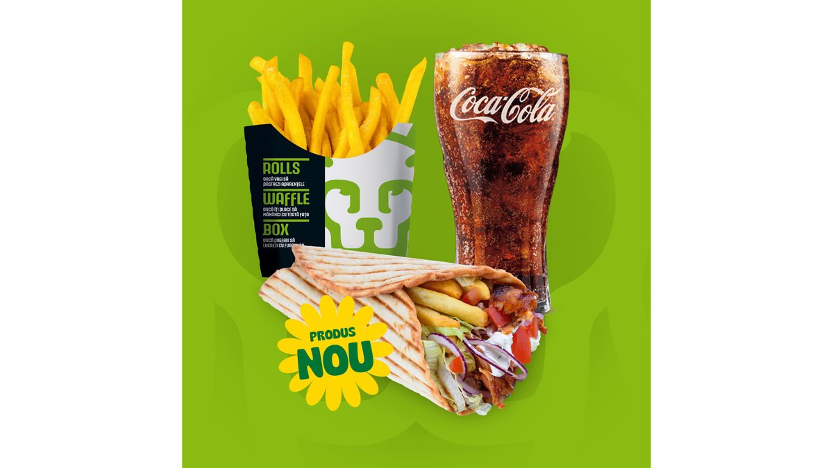 Crispy pita, carne rotisata, cartofi rondele, ciuperci sotate cu ceapa, ardei copti, castraveti murati, mozzarella, cedar si sos de ardei putin picant. Meniul contine o portie de cartofi si o bautura racoritoare.