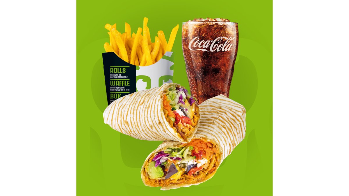 Lipie crispy, salată iceberg, varză roșie, morcov, roșii, castraveți, vinete, dovlecei, ardei, cartofi la cuptor, brânză Feta și sos King Rolls. Bautura si cartofi prajiti/dippers.