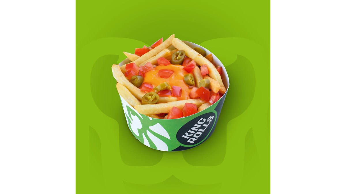 Lipie crispy, carne de pui și curcan sau curcan și vițel, bacon, cartofi prăjiti, roșii, salată iceberg, castraveți murați, sos nachos și sos King Rolls.