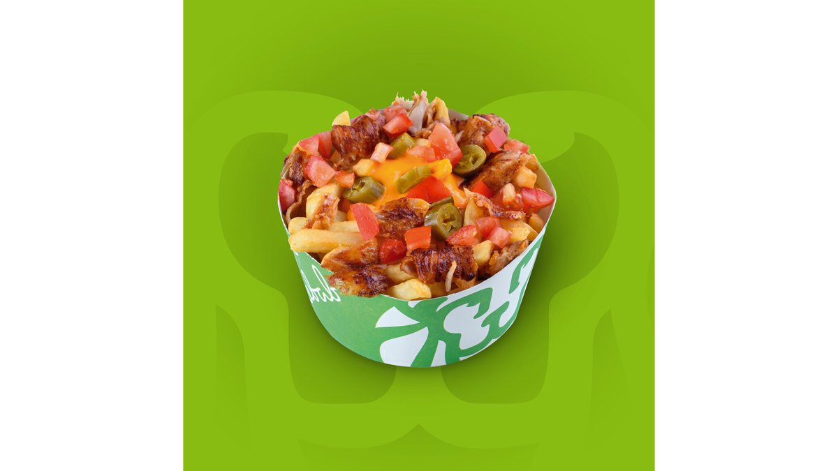 Cartofi prăjiți, carne rotisată, sos nachos, ardei iuți jalapeno, roșii.