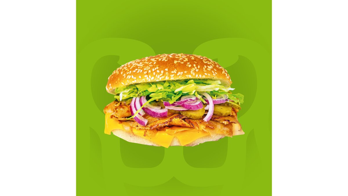 Chiflă burger, carne rotisată, brânză Chedar, salată iceberg, ceapă, castraveți murați și sos Barbeque.