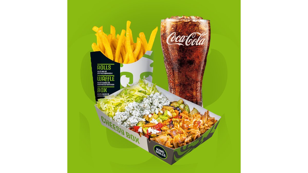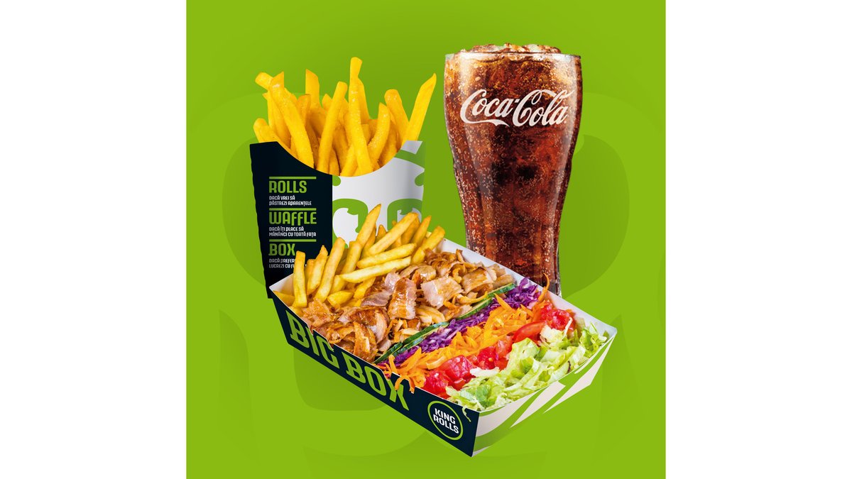 Meniul cuprinde 1 Rolls, 1 Waffle, 1 Box, 3x băuturi, 3x cartofi prăjiți, 3x sosuri King Rolls. Poți alege mărimea sandviș-urilor medie sau mare și tipul de carne.