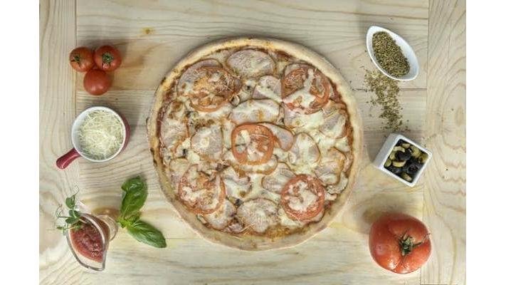 Sos de roșii, piept de pui afumat, ciuperci, roșii proaspete, brânză telemea, parmezan, mozzarella- 2200 g