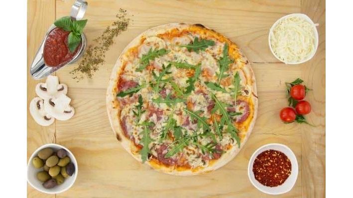 Sos usturoi, mozzarella, ciuperci, bacon, gorgonzola, rucola, condimente- 2200 g