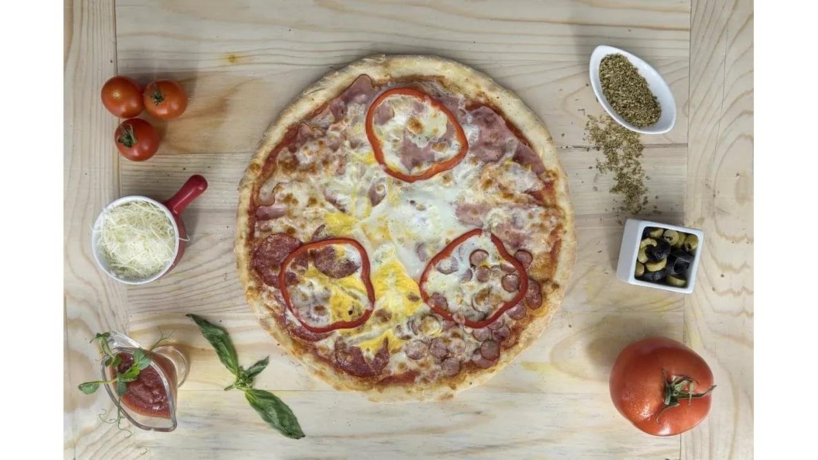 Sos, mozzarella, șuncă, ou, salam, cârnați, bacon, ardei gras, condimente- 2200 g