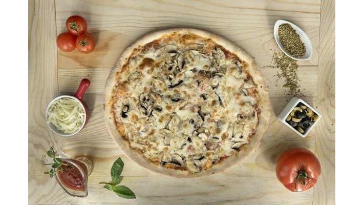 Sos, mozzarella, ciuperci, șuncă, bacon, condimente, sos de usturoi- 615 g