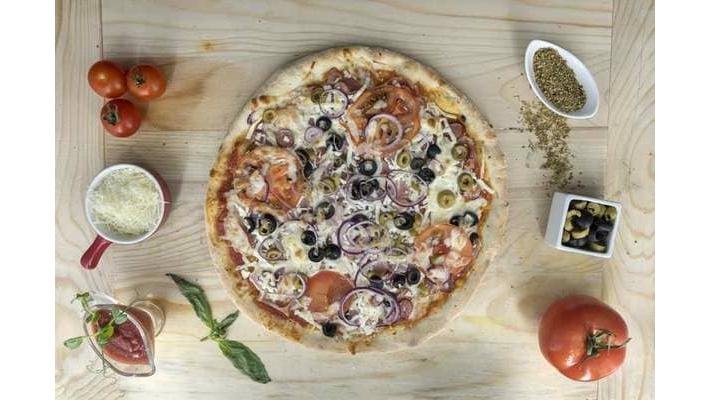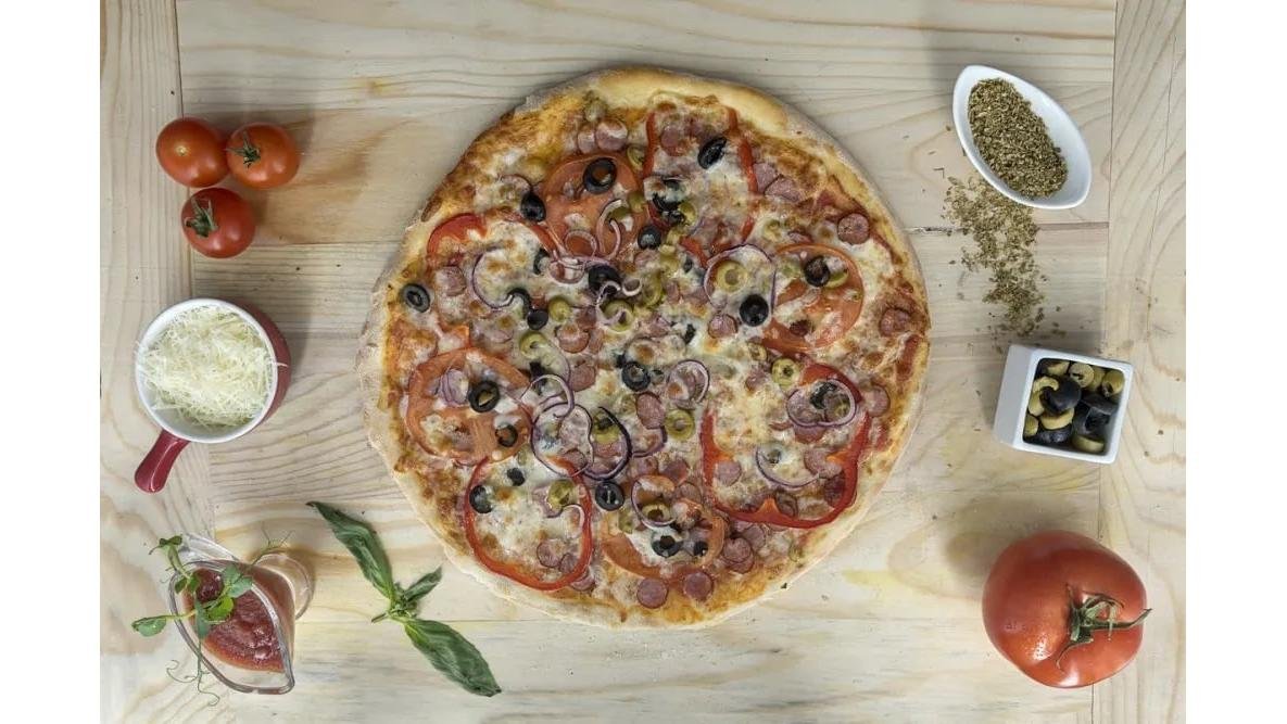 Sos, mozzarella, ceapă, cârnați, măsline, roșii, ardei gras, condimente- 2200 g
