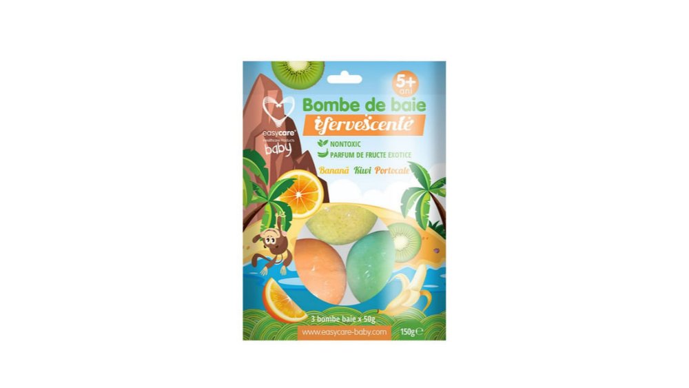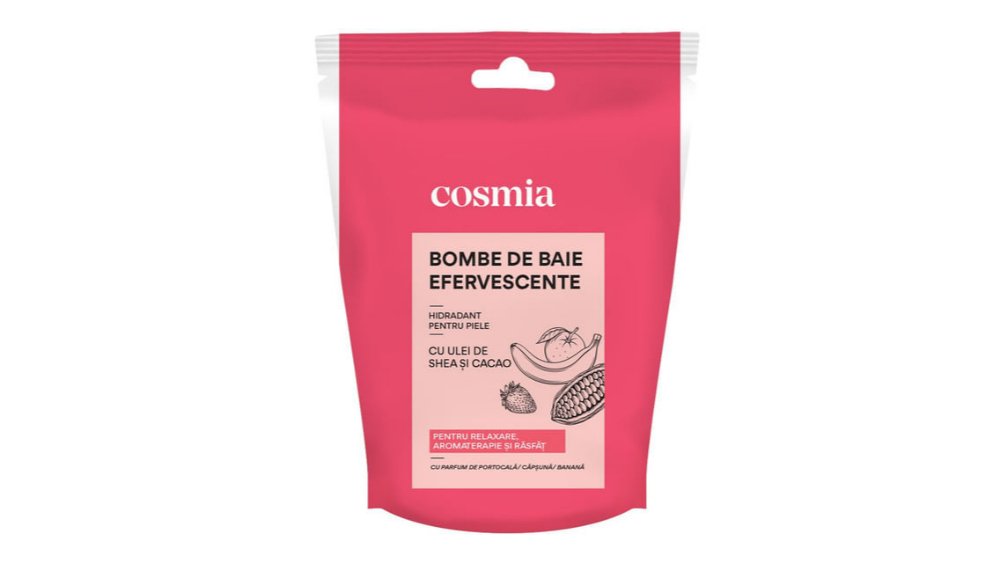 Bomba de baie efervescenta Cosmia cu parfum de portocala, capsuna si banana, 3 x 50 g