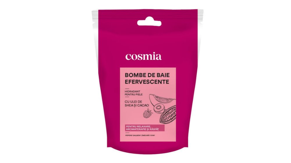 Bomba de baie efervescenta Cosmia cu parfum de pepene galben, zmeura si kiwi, 3 x 50 g