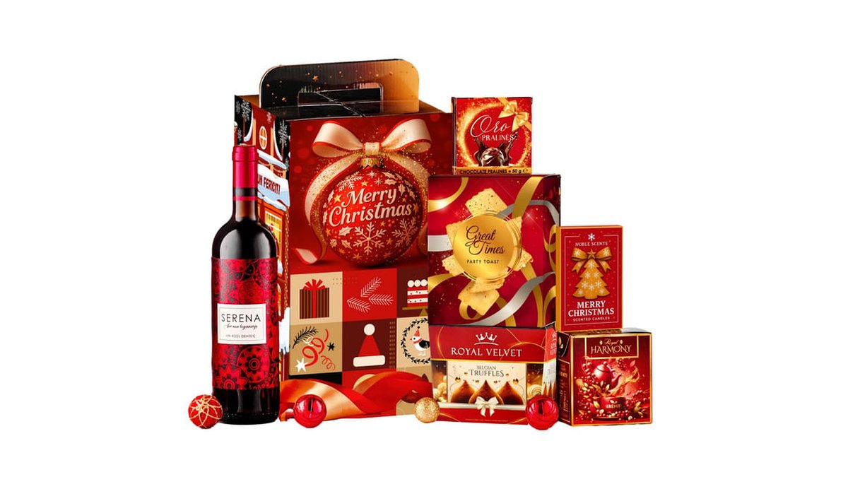 Cos pentru cadou Datini de Craciun, vin rosu, dulciuri, ornamente, lamanare parfumata si difuzor de camera