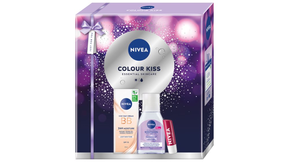 Set pentru cadou Nivea Color Kiss: crema de zi 50ml, apa micelara 100ml si balsam buze 5.5ml
