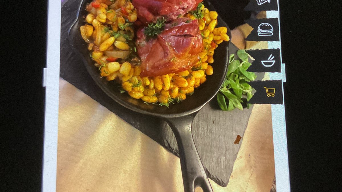 Scărițe porc la grătar, cartofi țărănești, castraveți murați, baghetă pâine, ketchup