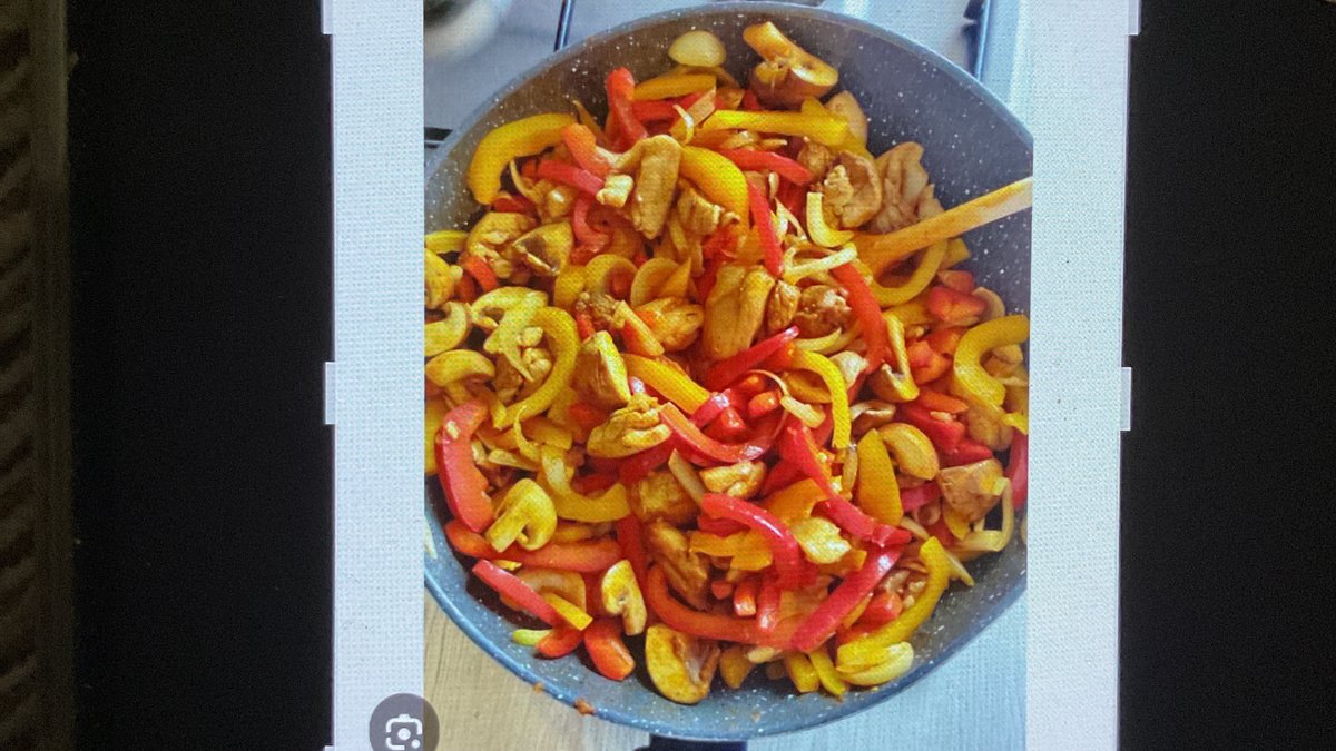 Carne porc, ardei gras, ceapă, usturoi, ardei iute, ciuperci Champignon și hribi, roșii
