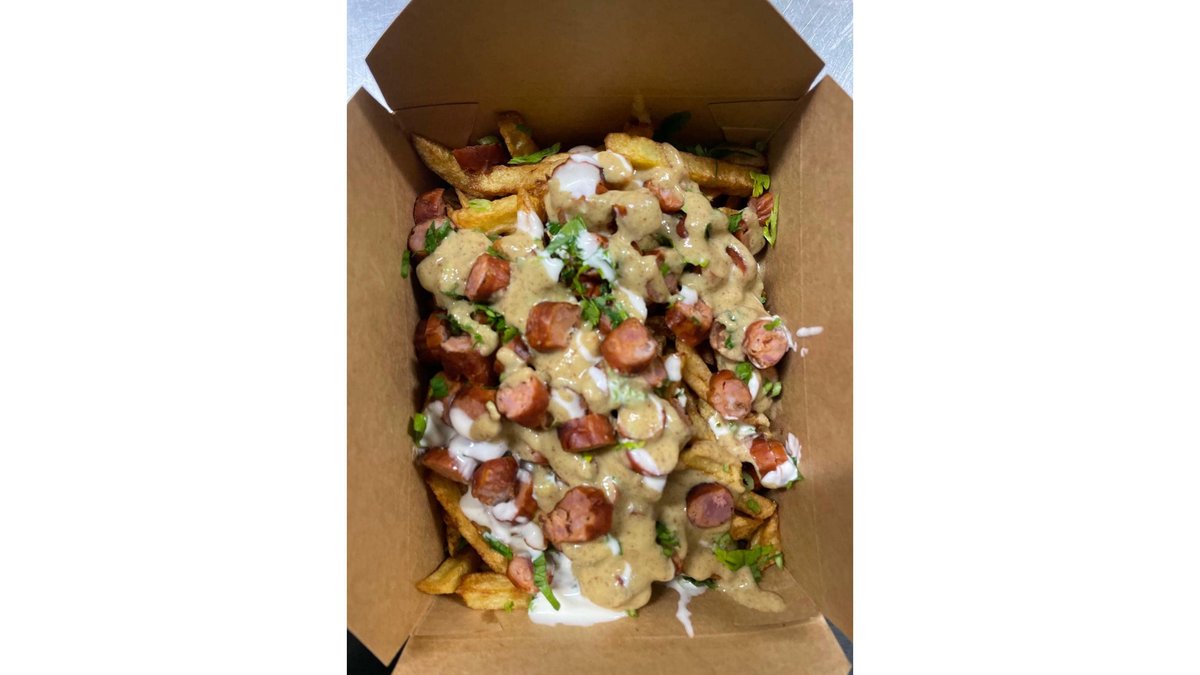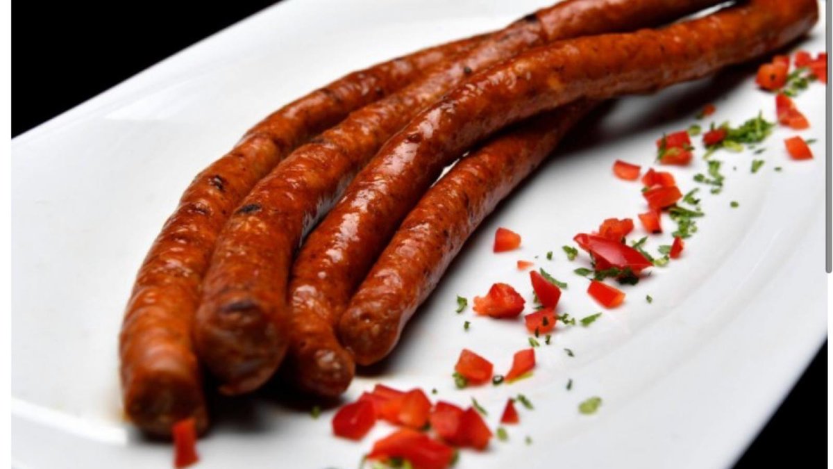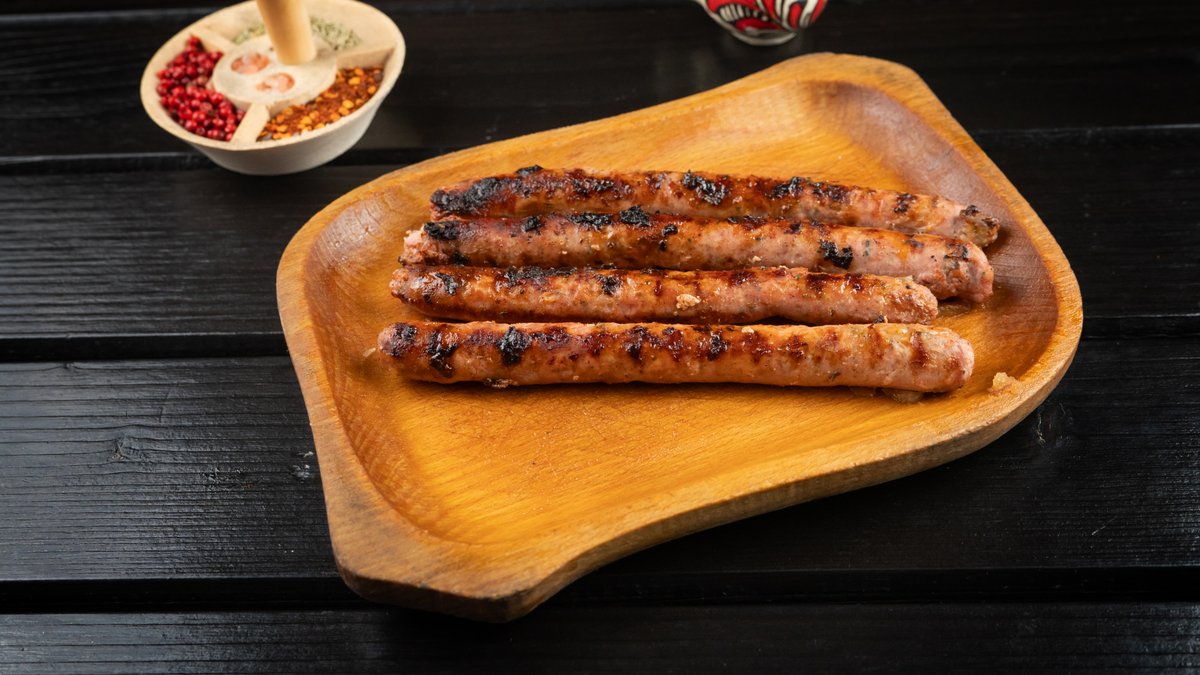 Cârnăciori picanți de porc (3 buc), cartofi pai naturali (150 g), chiflă (80 g), salată (130 g) sau sos la alegere (50 g).