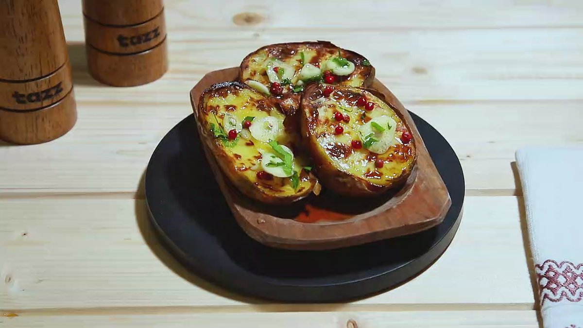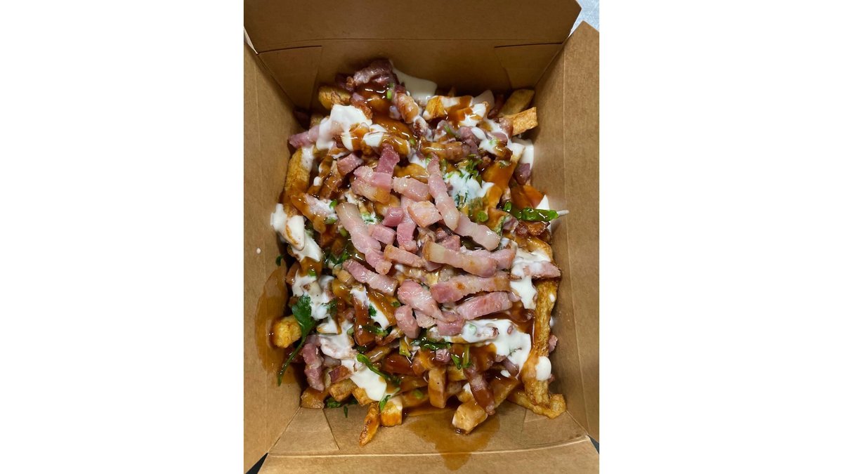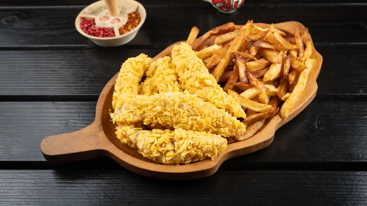 Crispy (150 g), fulgi de porumb, cartofi pai naturali (150 g), chiflă (80 g), maioneză cu usturoi (50 g).